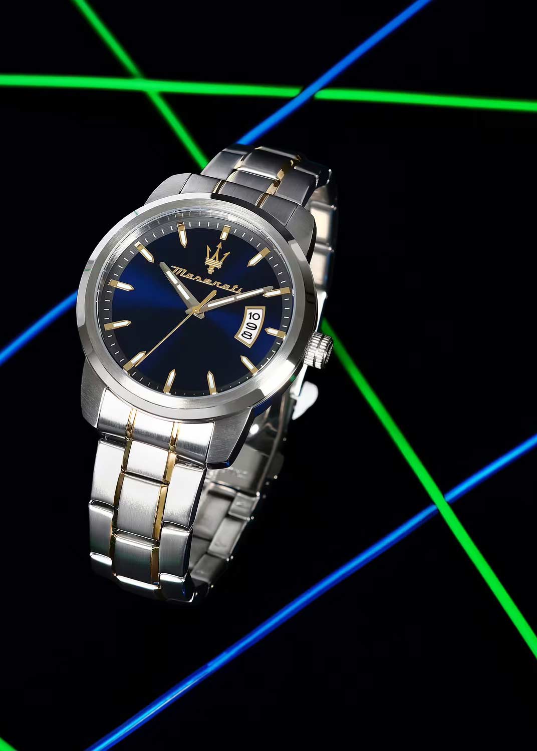 Мужские наручные часы. Круглый стальной корпус. Циферблат выполнен по технологии Sunray (солнечные лучи) и украшен фирменным логотипом ''Maserati''. Метки в виде штрихов.