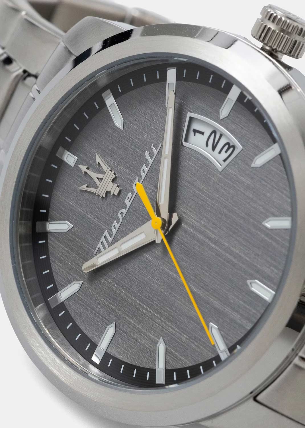 Мужские наручные часы. Круглый стальной корпус. Вертикально сатинированный циферблат украшен фирменным логотипом ''Maserati''. Метки в виде штрихов.