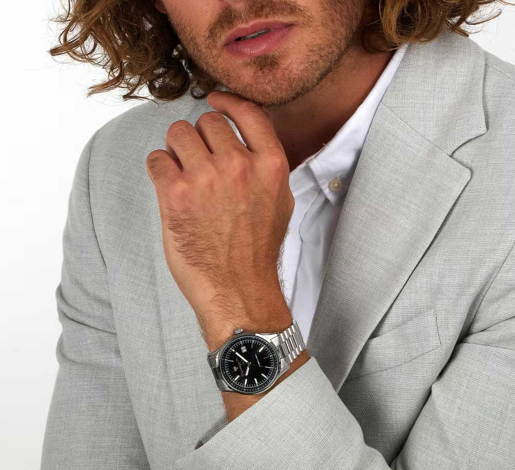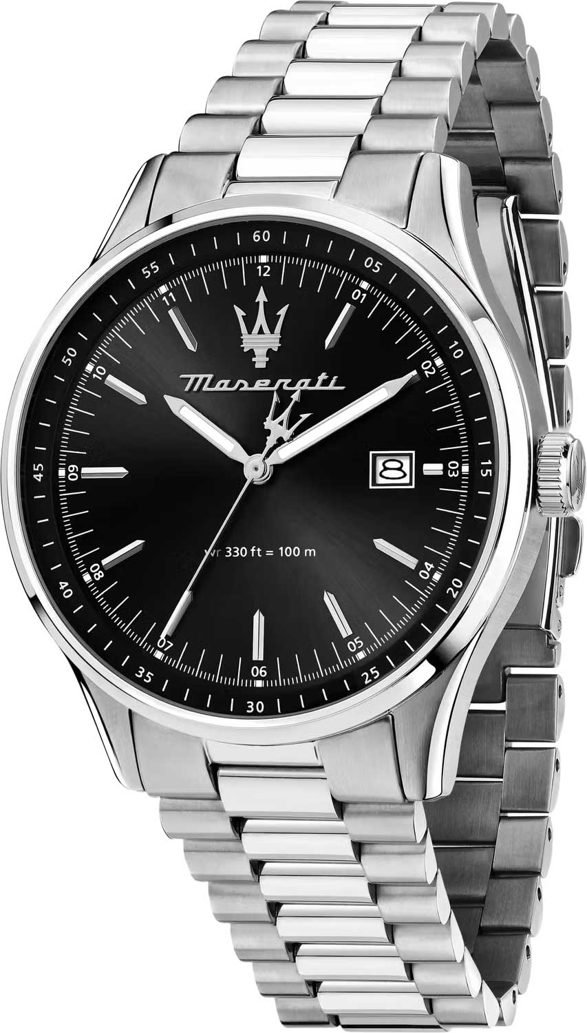 Мужские часы с круглым стальным корпусом. Циферблат выполнен по технологии Sunray (солнечные лучи) и украшен фирменным логотипом «Maserati». Метки в виде штрихов. Окошко даты находится в положении 3 часа. Завинчивающаяся задняя крышка и заводная головка. Браслет с раскладывающейся застежкой.