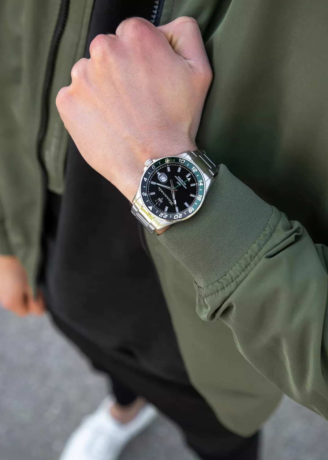 Мужские наручные часы. Круглый стальной корпус. Второй часовой пояс в 24-х часовом формате времени отображается центральной стрелкой. Циферблат с логотипом бренда защищен минеральным стеклом. Метки в виде штрихов.