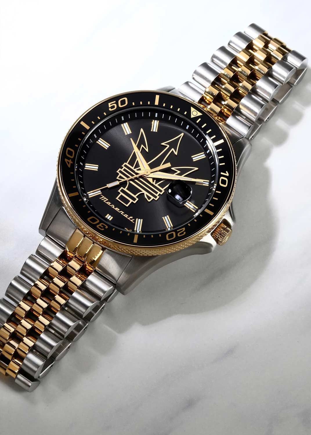 Мужские наручные часы. Круглый стальной корпус. Безель с минутной шкалой. Циферблат выполнен по технологии Sunray (солнечные лучи) и украшен фирменным логотипом ''Maserati''. Метки в виде штрихов.
