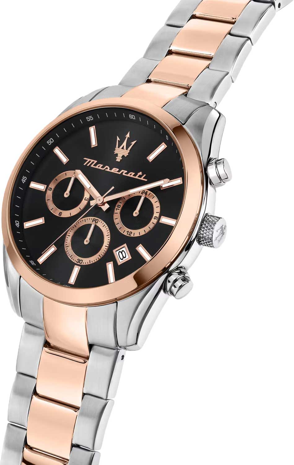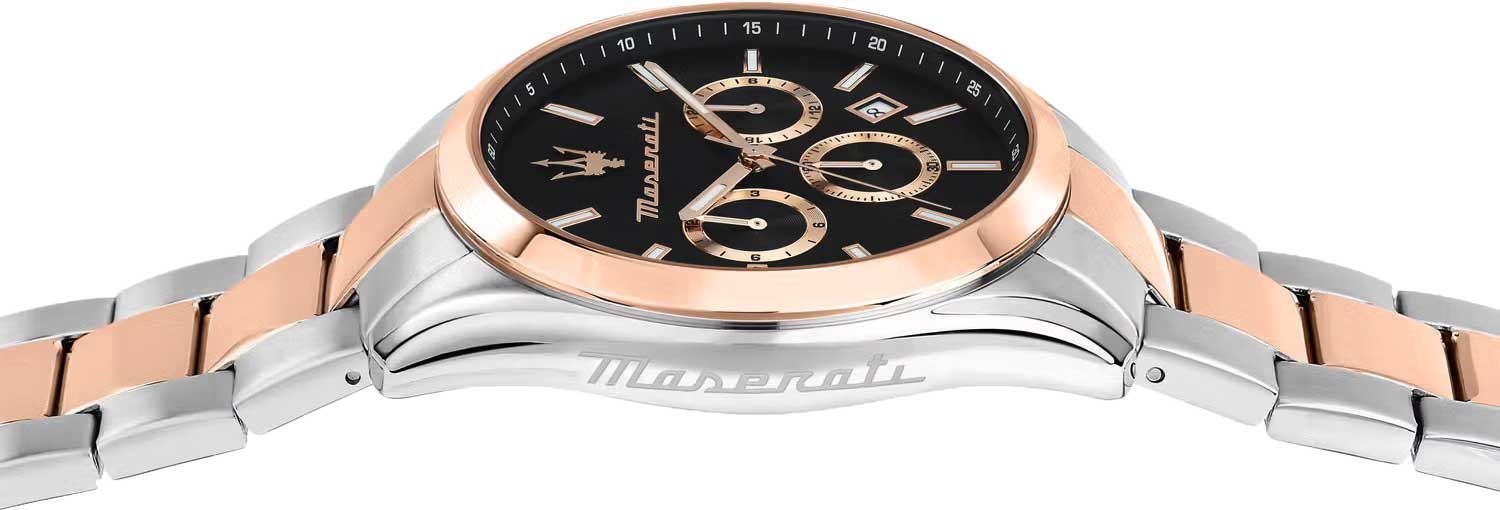 Мужские часы с круглым стальным корпусом. Второй часовой пояс. 12-ти и 24-х часовой формат времени. Циферблат выполнен по технологии Sunray (солнечные лучи) и украшен фирменным логотипом «Maserati». Метки в виде штрихов. Окошко даты находится в положении между отметками 4 и 5 часов. Браслет с раскладывающейся застежкой. Застежка с системой блокировки.