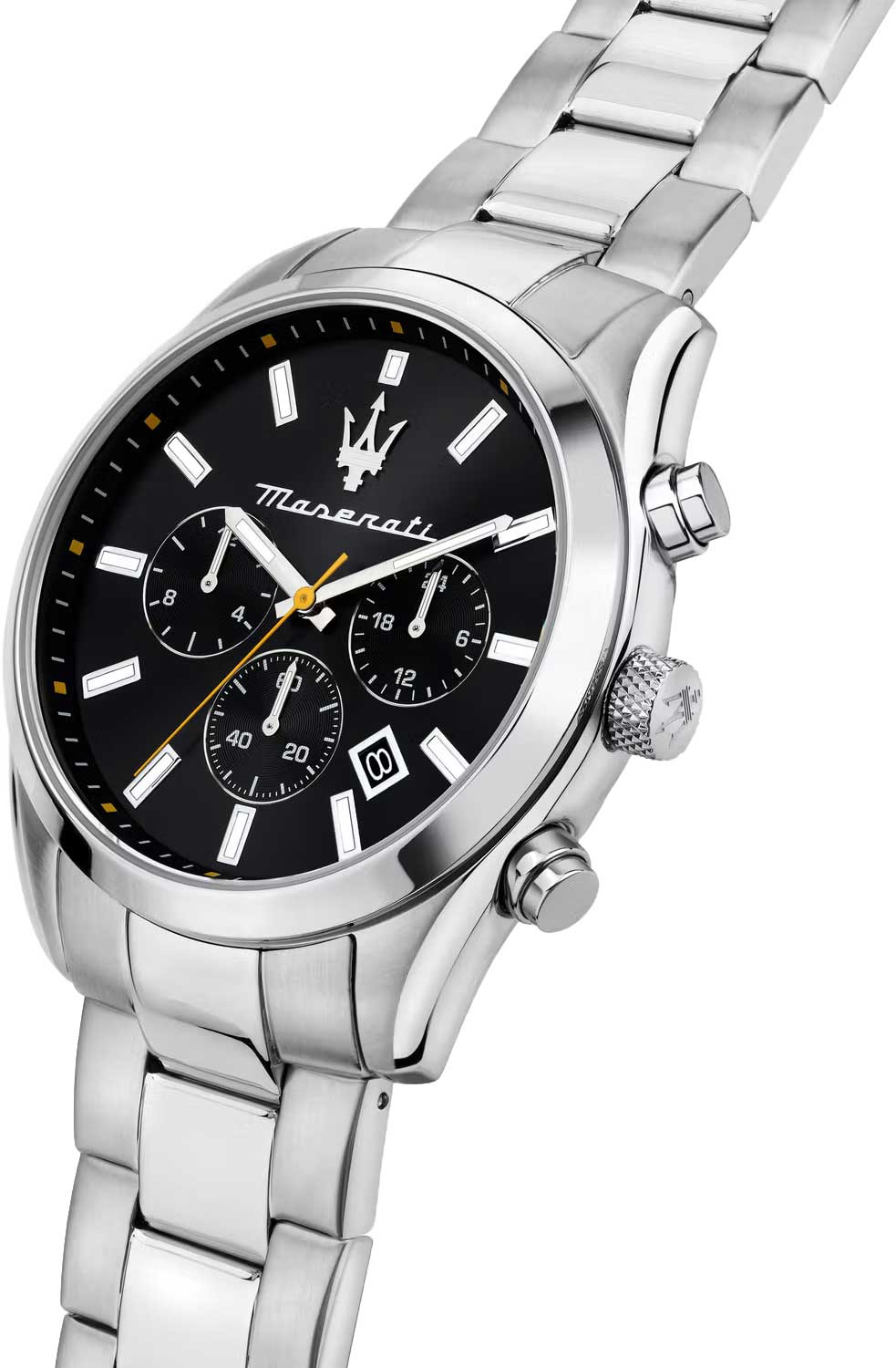 Мужские часы с круглым стальным корпусом. Второй часовой пояс. 12-ти и 24-х часовой формат времени. Циферблат выполнен по технологии Sunray (солнечные лучи) и украшен фирменным логотипом «Maserati». Метки в виде штрихов. Окошко даты находится в положении между отметками 4 и 5 часов. Браслет с раскладывающейся застежкой. Застежка с системой блокировки.