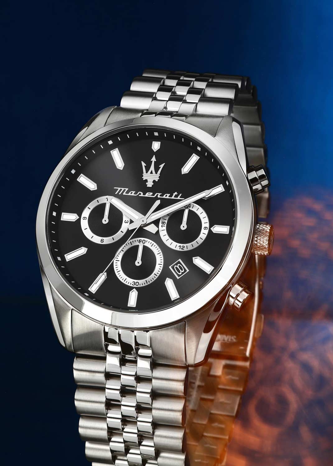 Мужские часы-хронограф с секундомером. 12-ти и 24-х часовой формат времени. Круглый стальной корпус. Циферблат выполнен по технологии Sunray (солнечные лучи) и украшен фирменным логотипом ''Maserati''. Метки в виде штрихов.