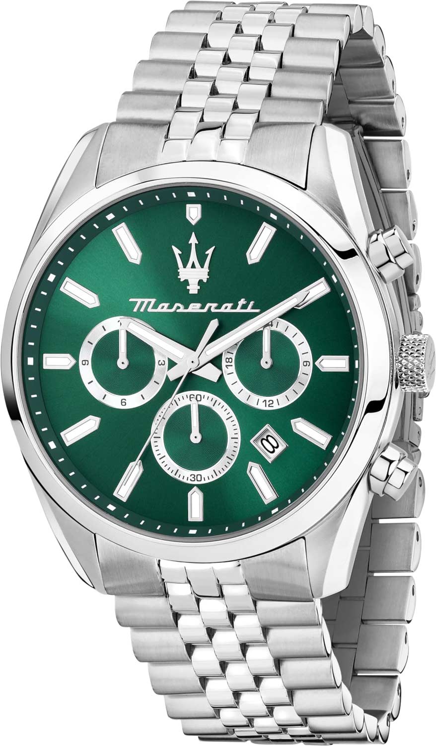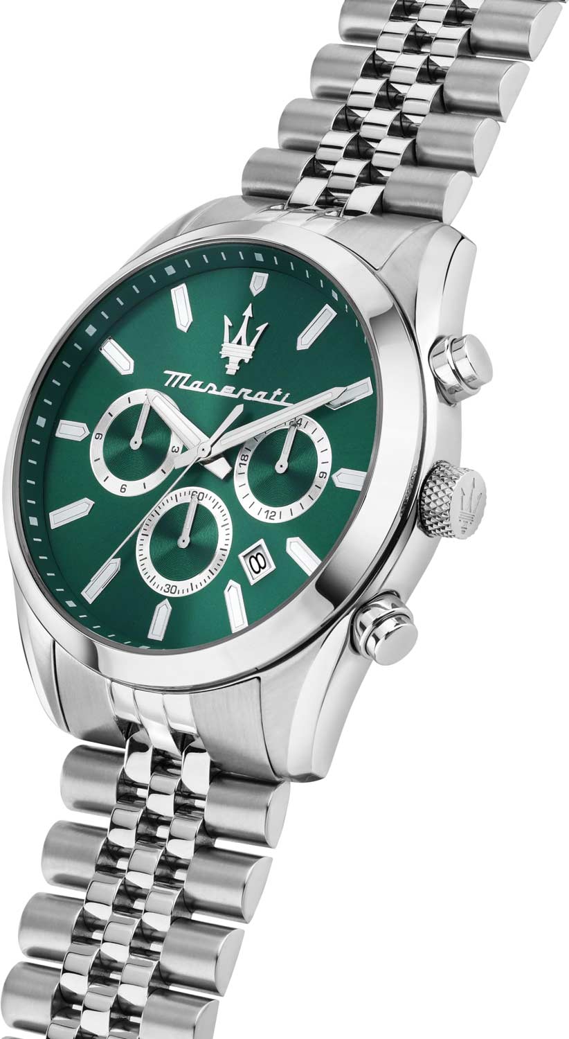 Мужские часы-хронограф с секундомером. 12-ти и 24-х часовой формат времени. Круглый стальной корпус. Циферблат выполнен по технологии Sunray (солнечные лучи) и украшен фирменным логотипом ''Maserati''. Метки в виде штрихов.