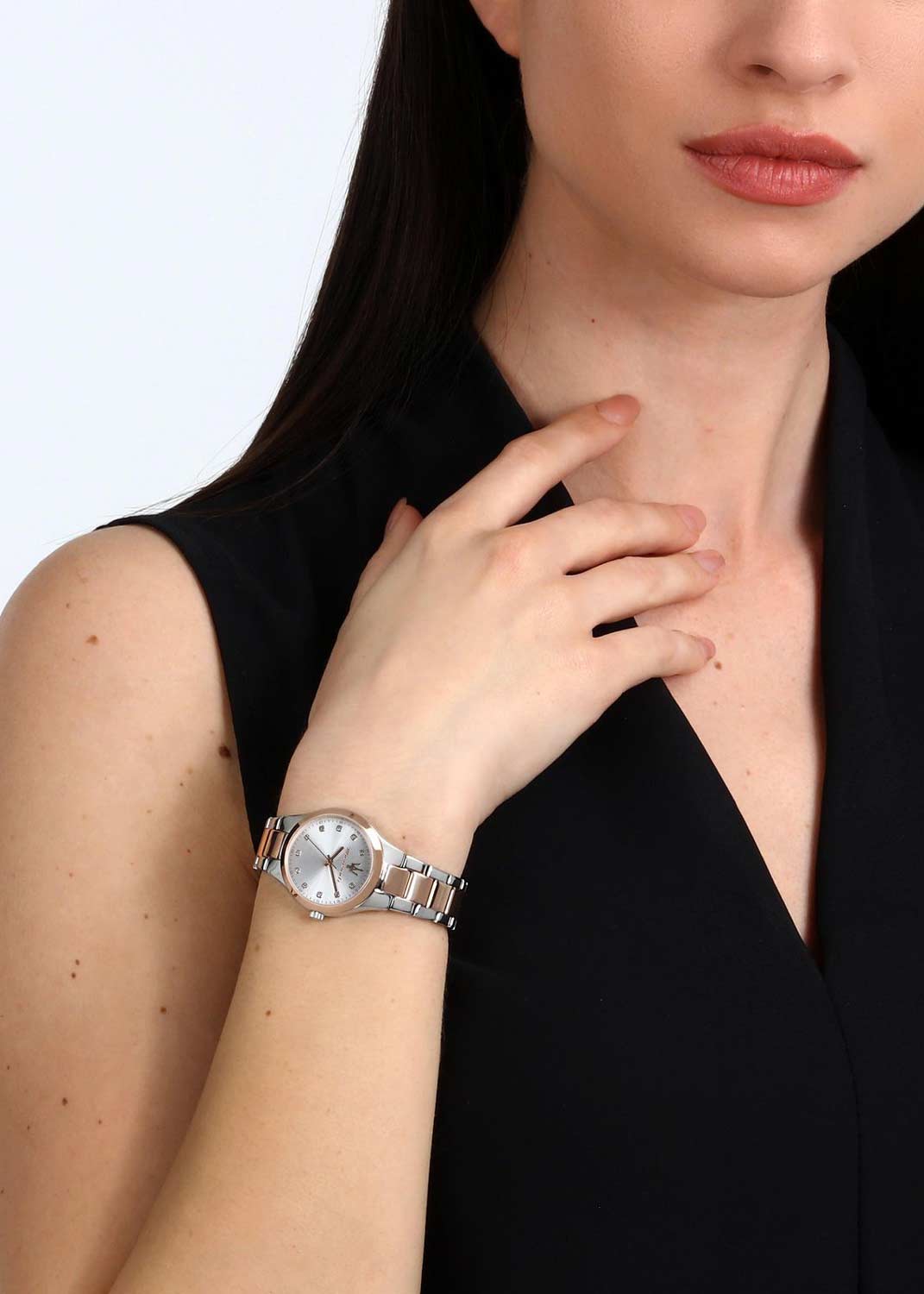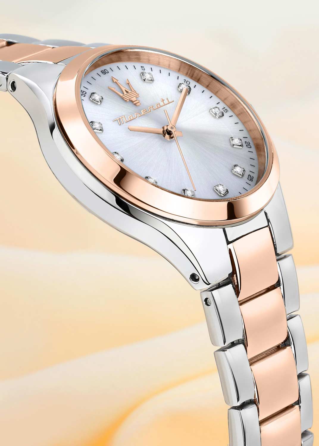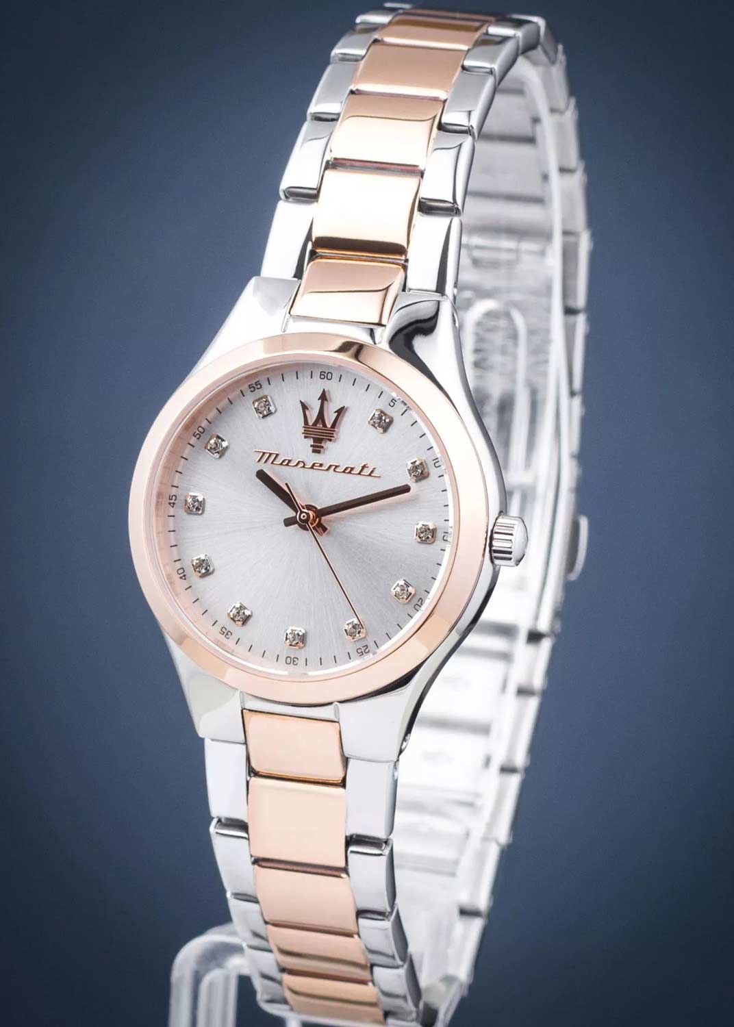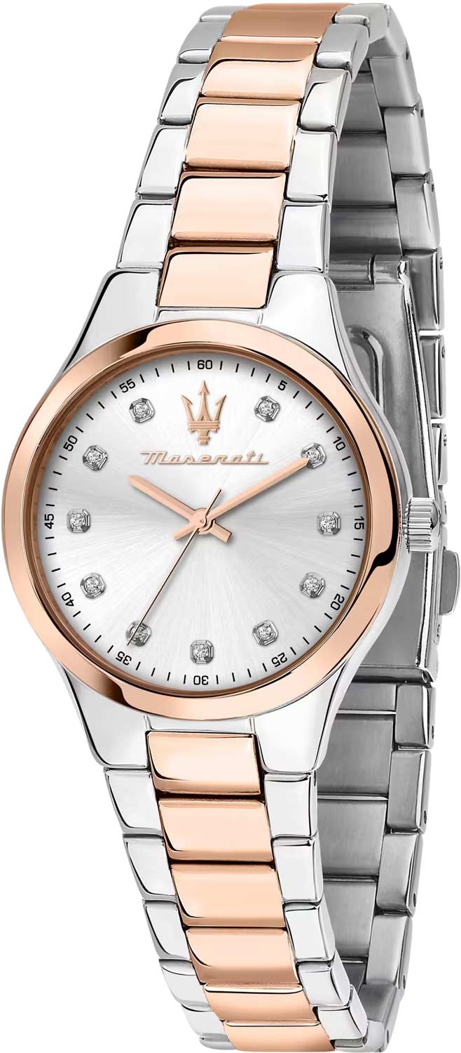 Женские наручные часы. Круглый стальной корпус. Циферблат выполнен по технологии Sunray (солнечные лучи) и украшен фирменным логотипом ''Maserati''. Метки в виде точек, инкрустированные кристаллами. Рифленая заводная головка. Браслет с раскладывающейся застежкой.