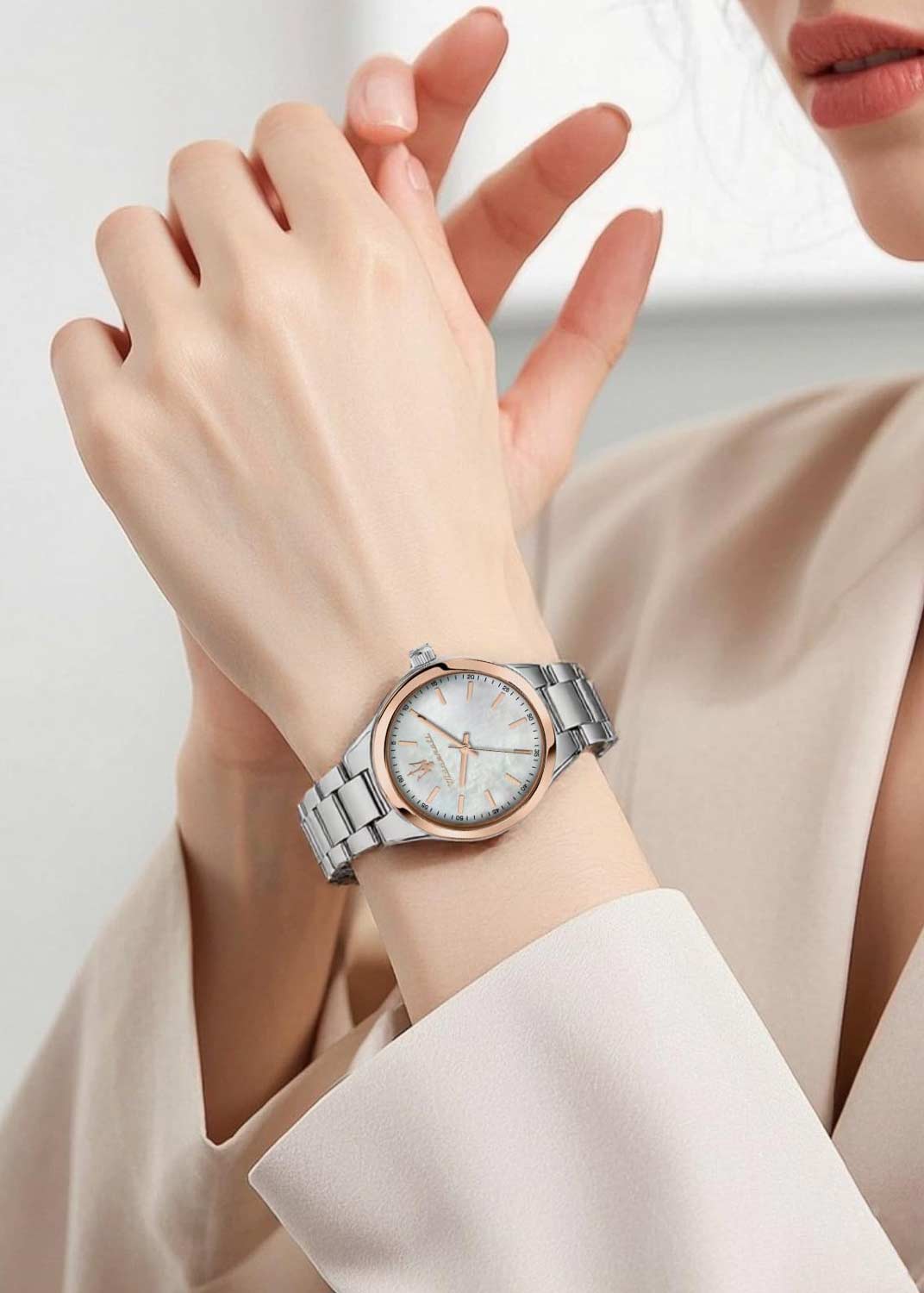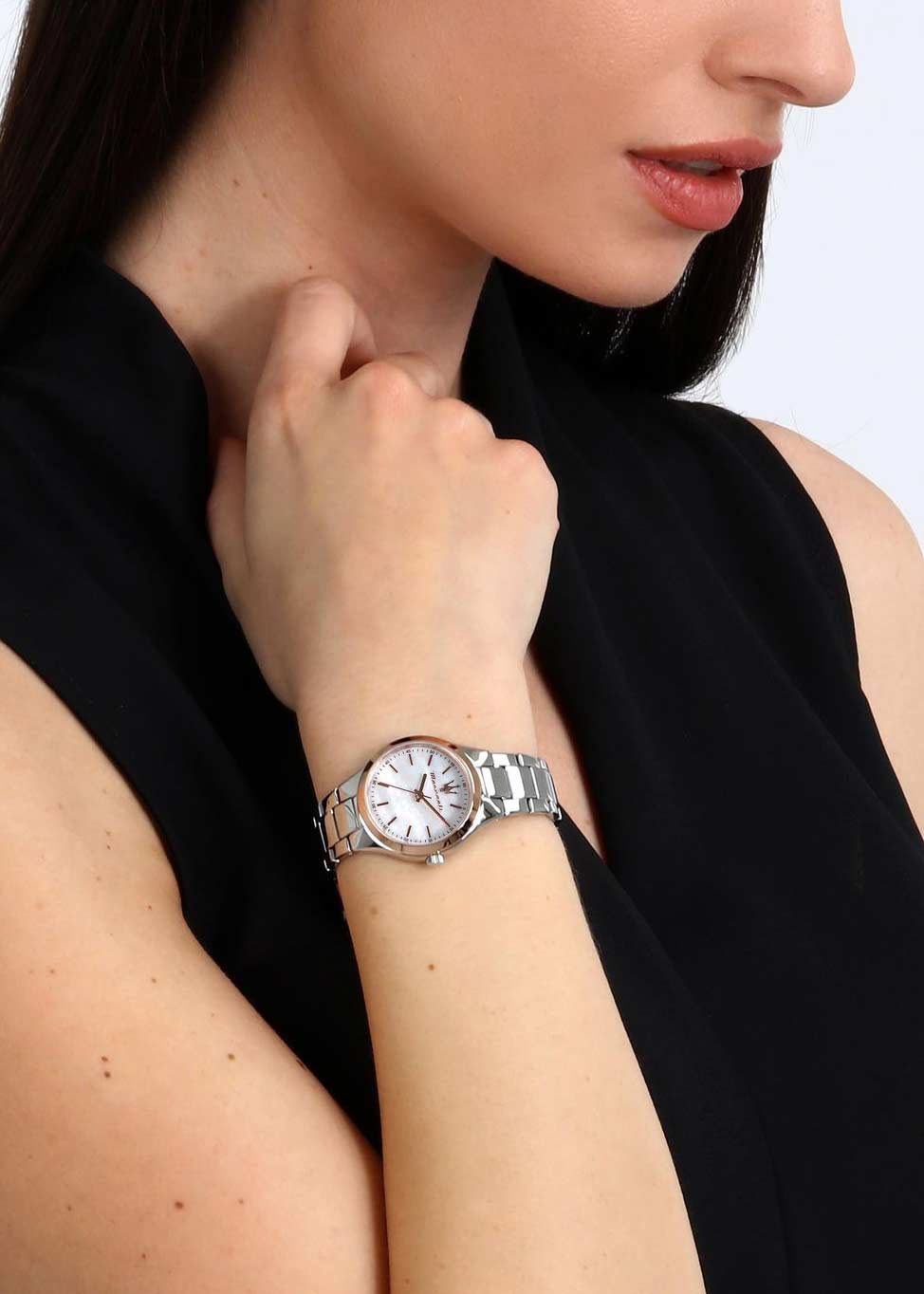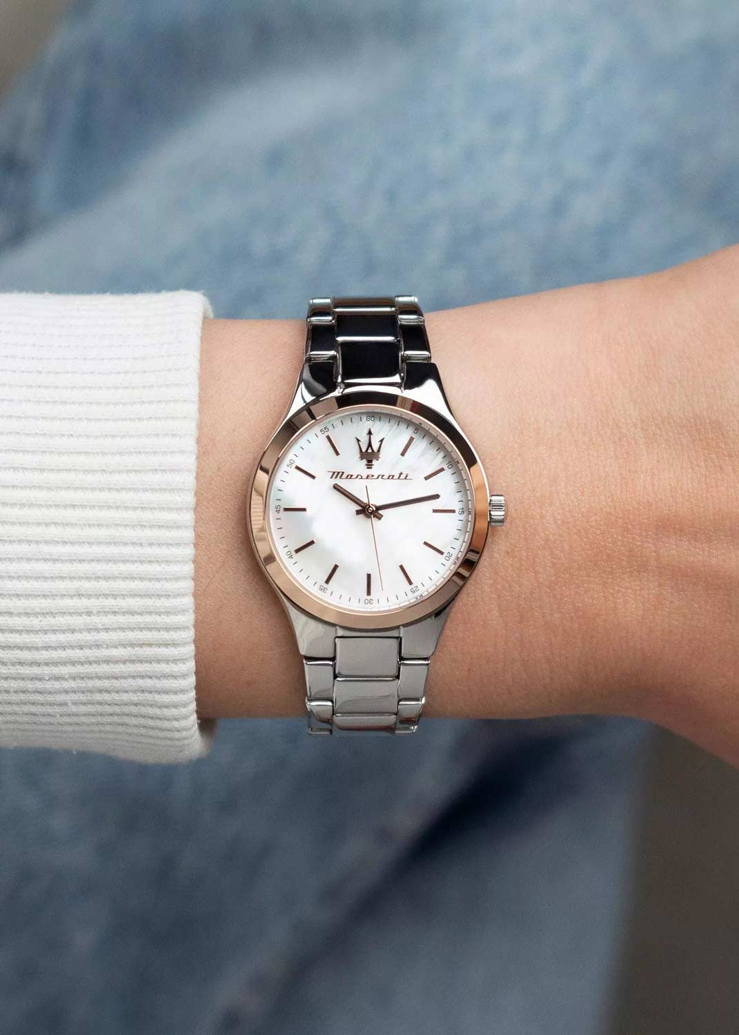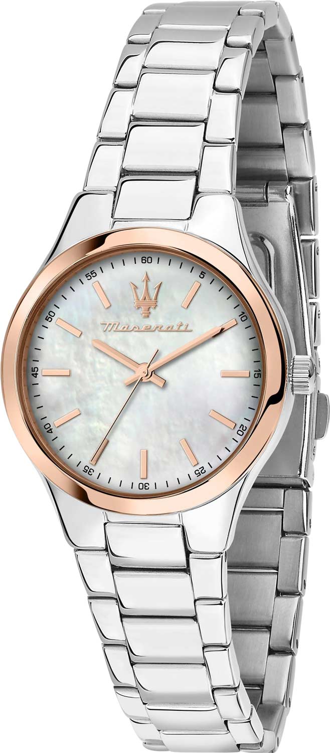 Женские наручные часы. Круглый стальной корпус. Перламутровый циферблат украшен фирменным логотипом ''Maserati''. Метки в виде штрихов. Рифленая заводная головка. Браслет с раскладывающейся застежкой.