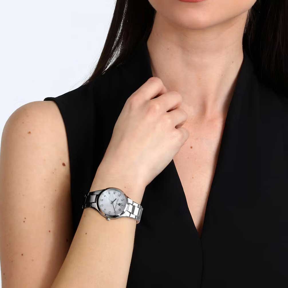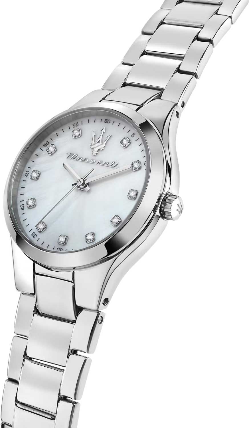 Женские часы с круглым стальным корпусом. Перламутровый циферблат украшен фирменным логотипом «Maserati». Метки в виде точек, инкрустированные кристаллами. Браслет с раскладывающейся застежкой.