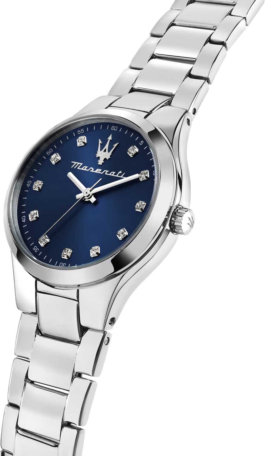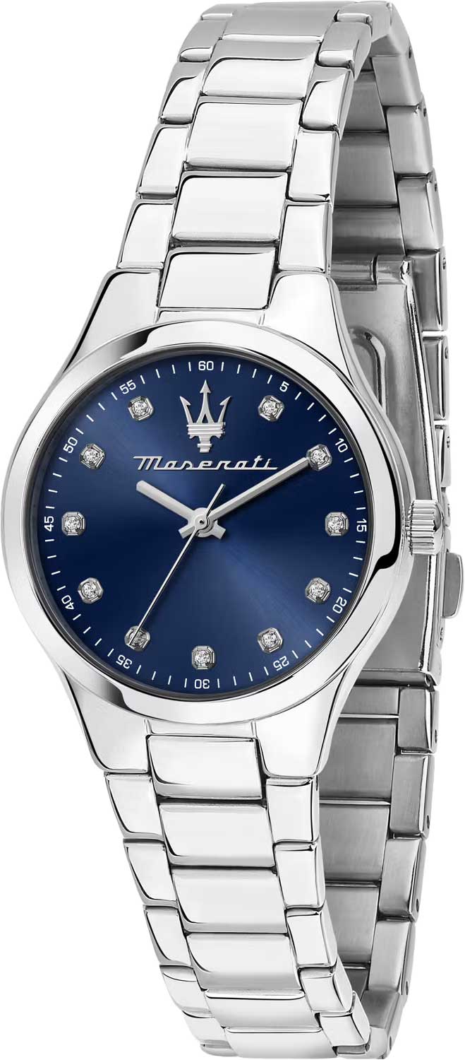 Женские часы с круглым стальным корпусом. Циферблат выполнен по технологии Sunray (солнечные лучи) и украшен фирменным логотипом «Maserati». Метки в виде точек, инкрустированные кристаллами. Браслет с раскладывающейся застежкой.