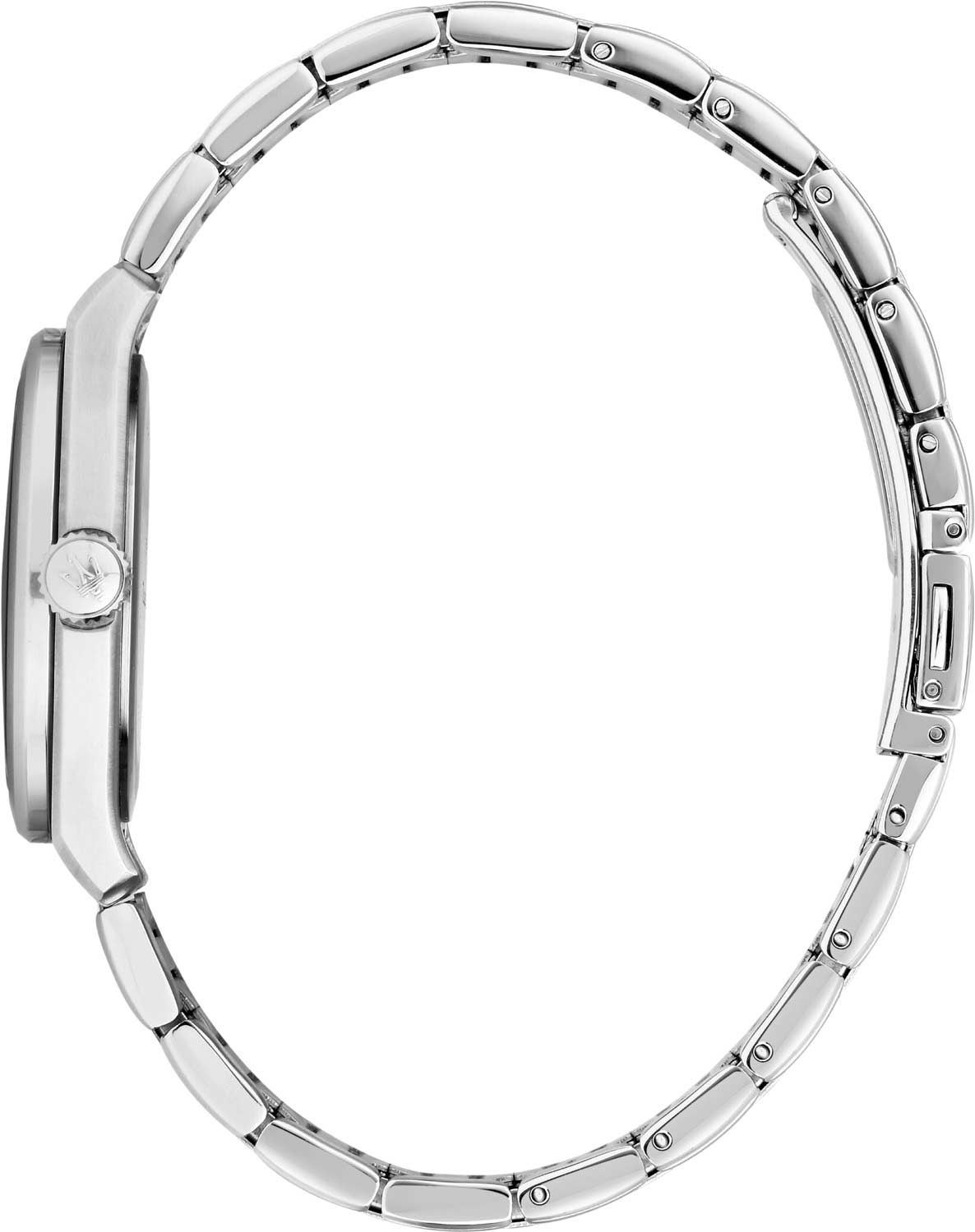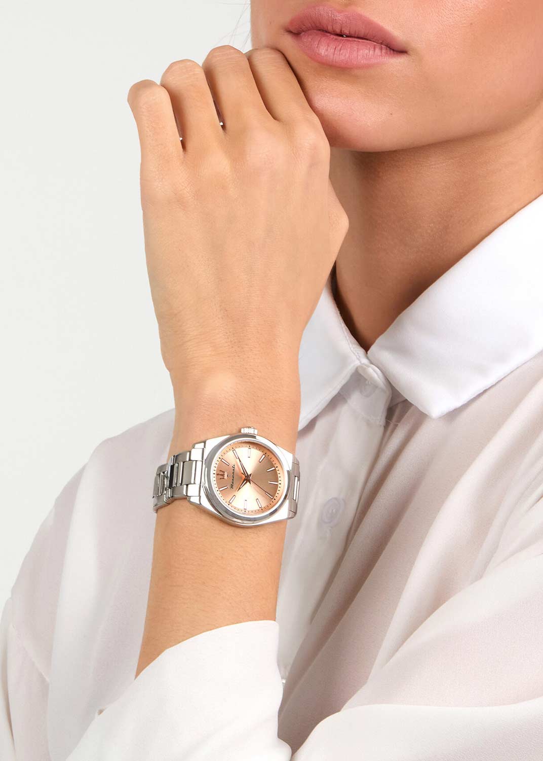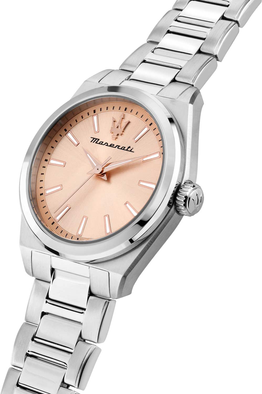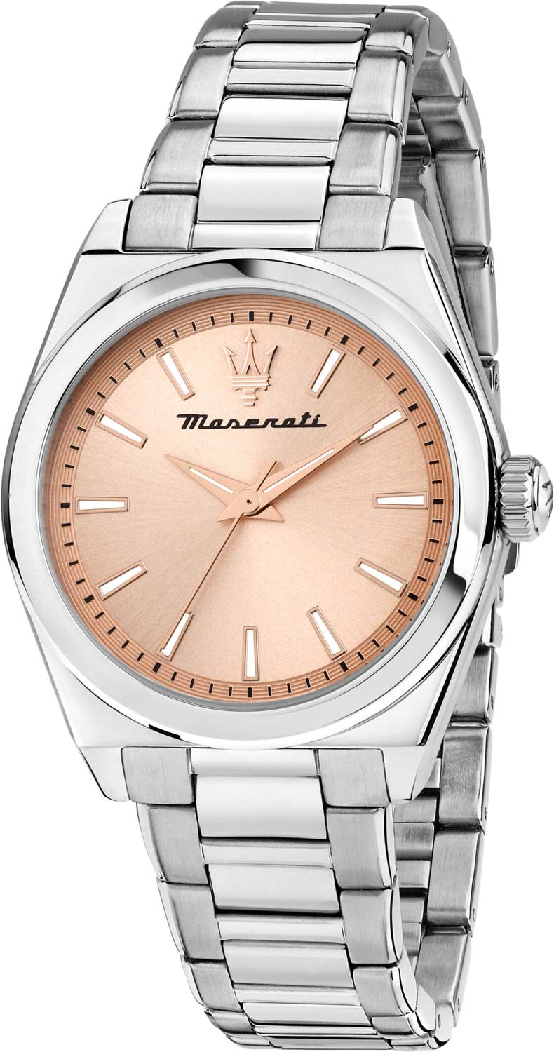 Женские наручные часы. Круглый стальной корпус. Циферблат выполнен по технологии Sunray (солнечные лучи) и украшен фирменным логотипом ''Maserati''. Метки в виде штрихов. Рифленая заводная головка. Браслет с раскладывающейся застежкой.