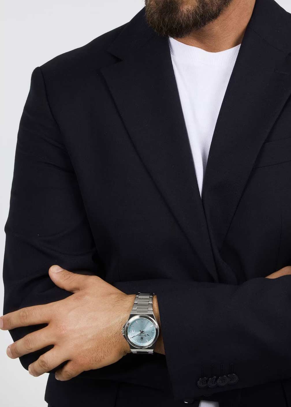 Метки в виде штрихов. Окошко даты находится в положении 3 часа. Рифленая заводная головка с защитой. Браслет с раскладывающейся застежкой.