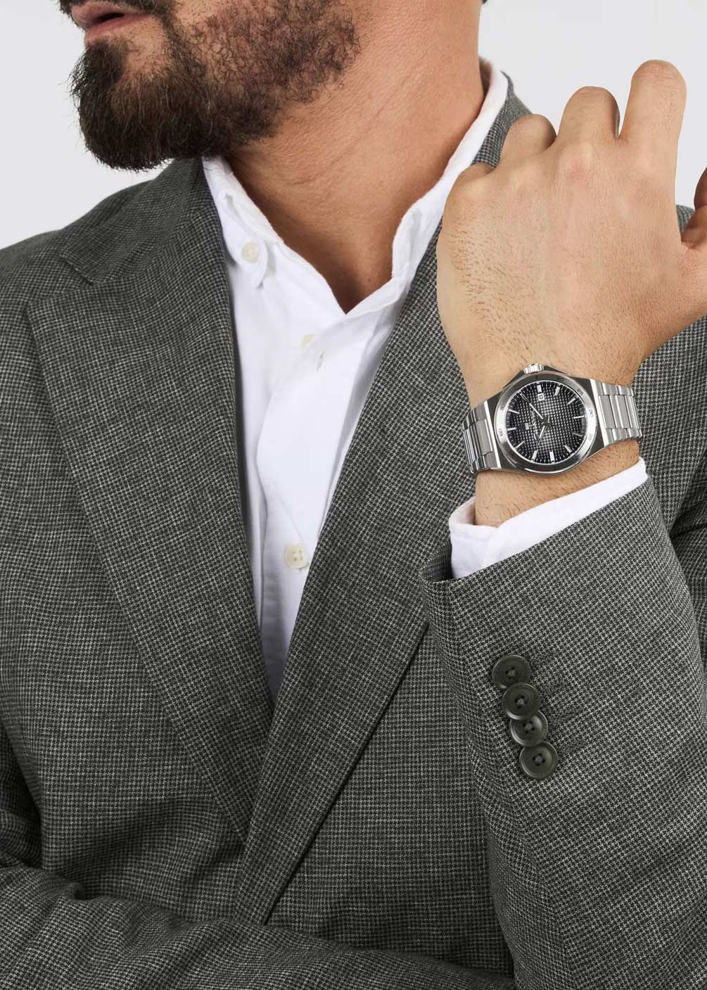 Метки в виде штрихов. Окошко даты находится в положении 3 часа. Рифленая заводная головка с защитой. Браслет с раскладывающейся застежкой.