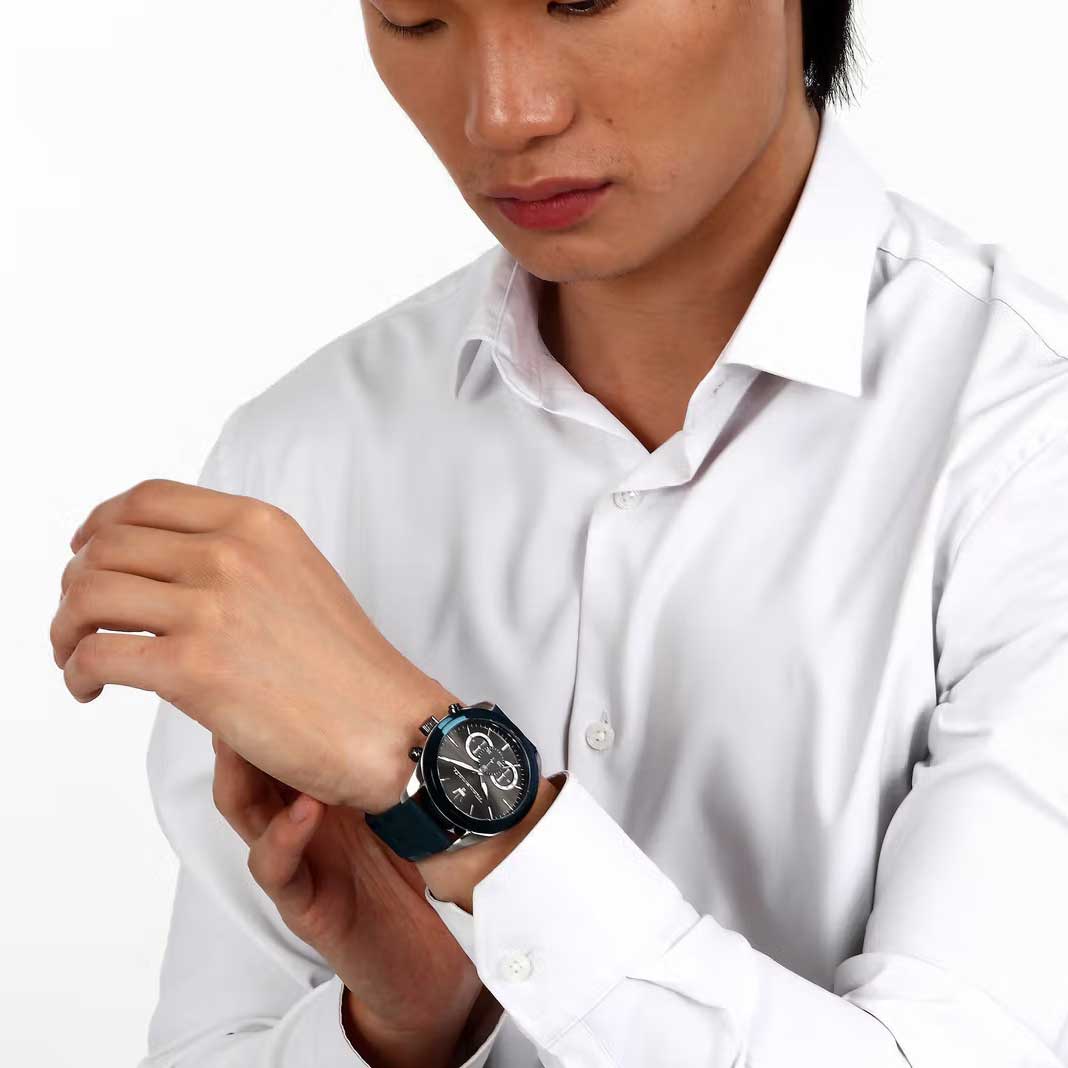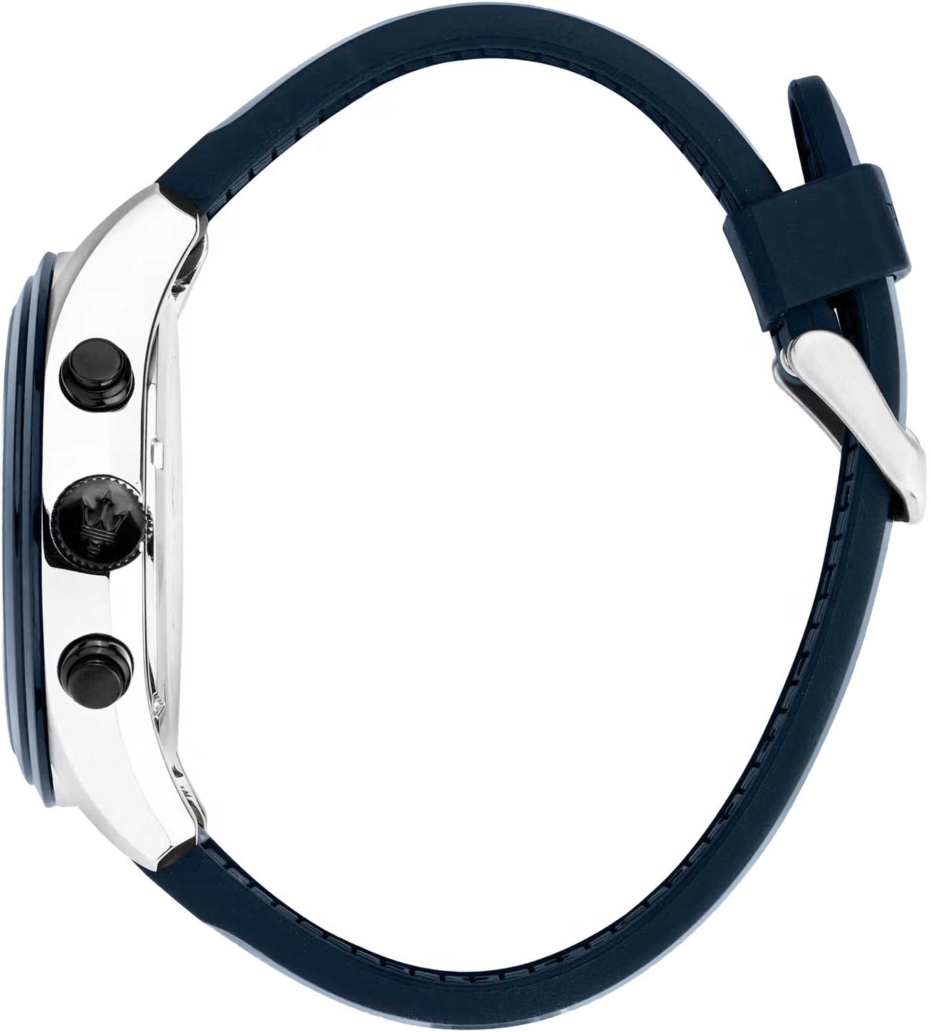 Часы-хронограф с секундомером до 30мин. 12-ти и 24-х часовой формат времени. Циферблат выполнен по технологии Sunray (солнечные лучи) и украшен фирменным логотипом «Maserati». Метки в виде штрихов. Завинчивающаяся задняя крышка и заводная головка. Силиконовый ремешок с классической застежкой.