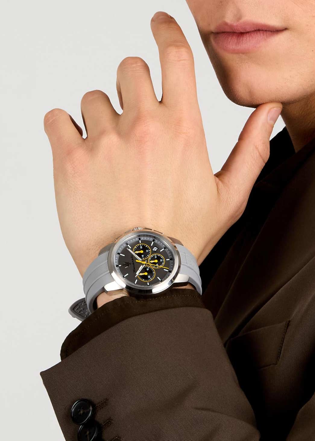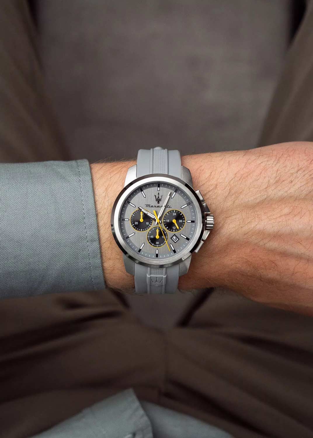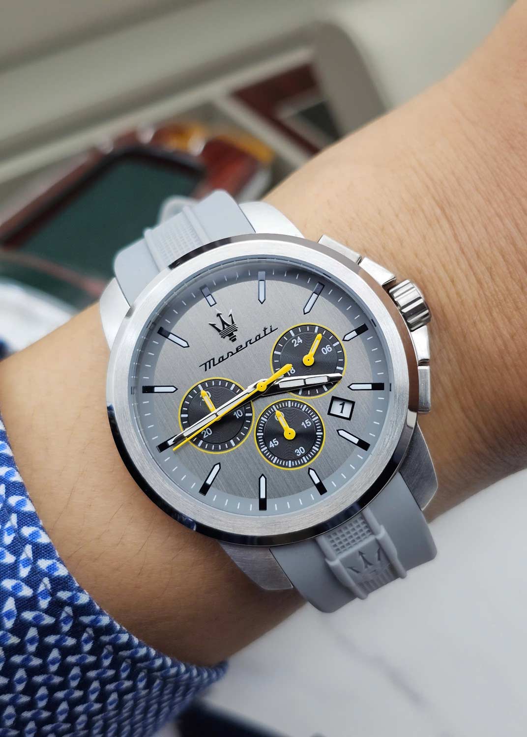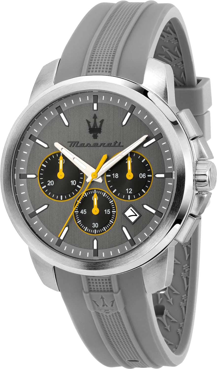 Часы-хронограф с секундомером. 12-ти и 24-х часовой формат времени. Круглый стальной корпус. Вертикально сатинированный циферблат украшен фирменным логотипом ''Maserati''. Метки в виде штрихов.