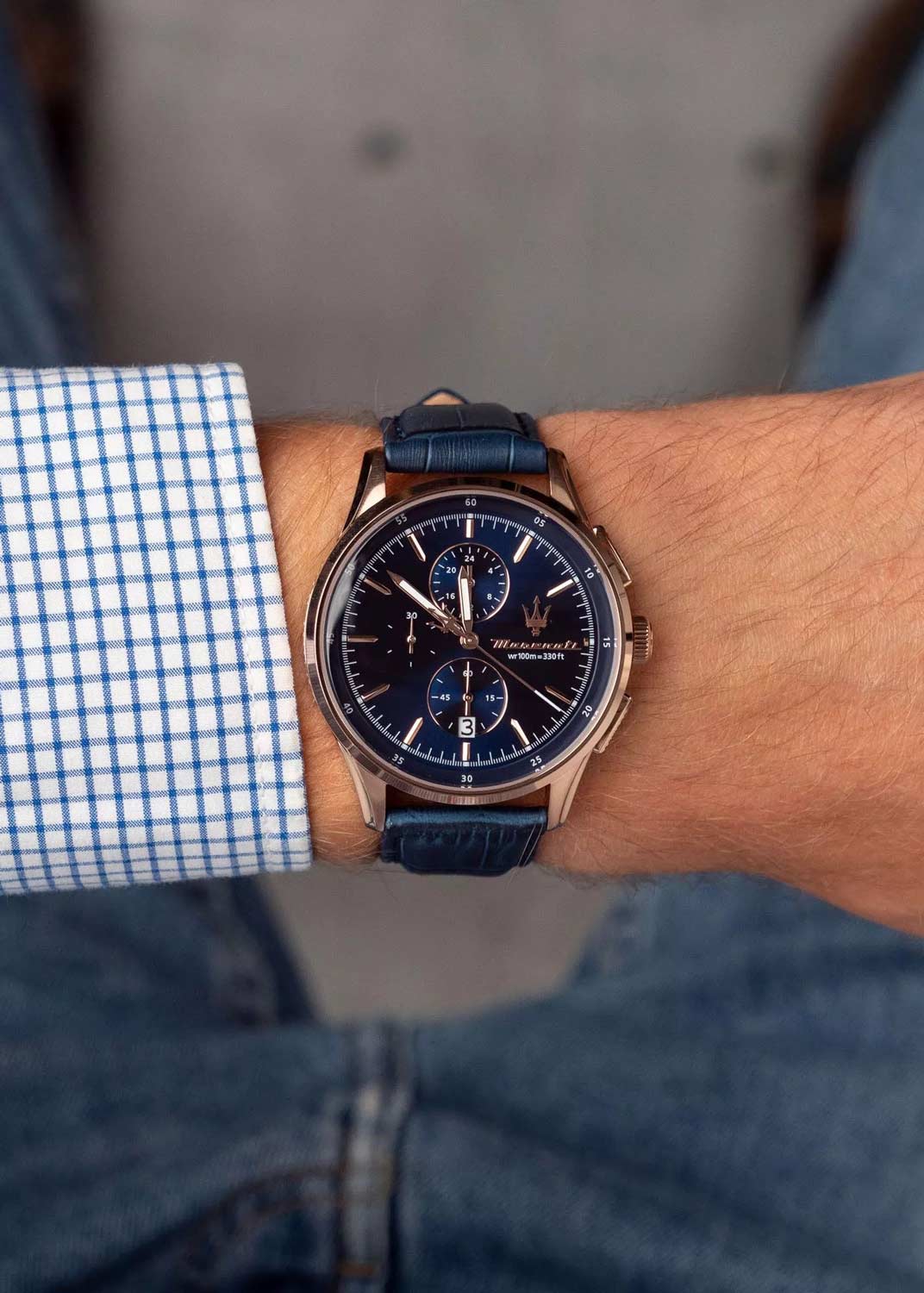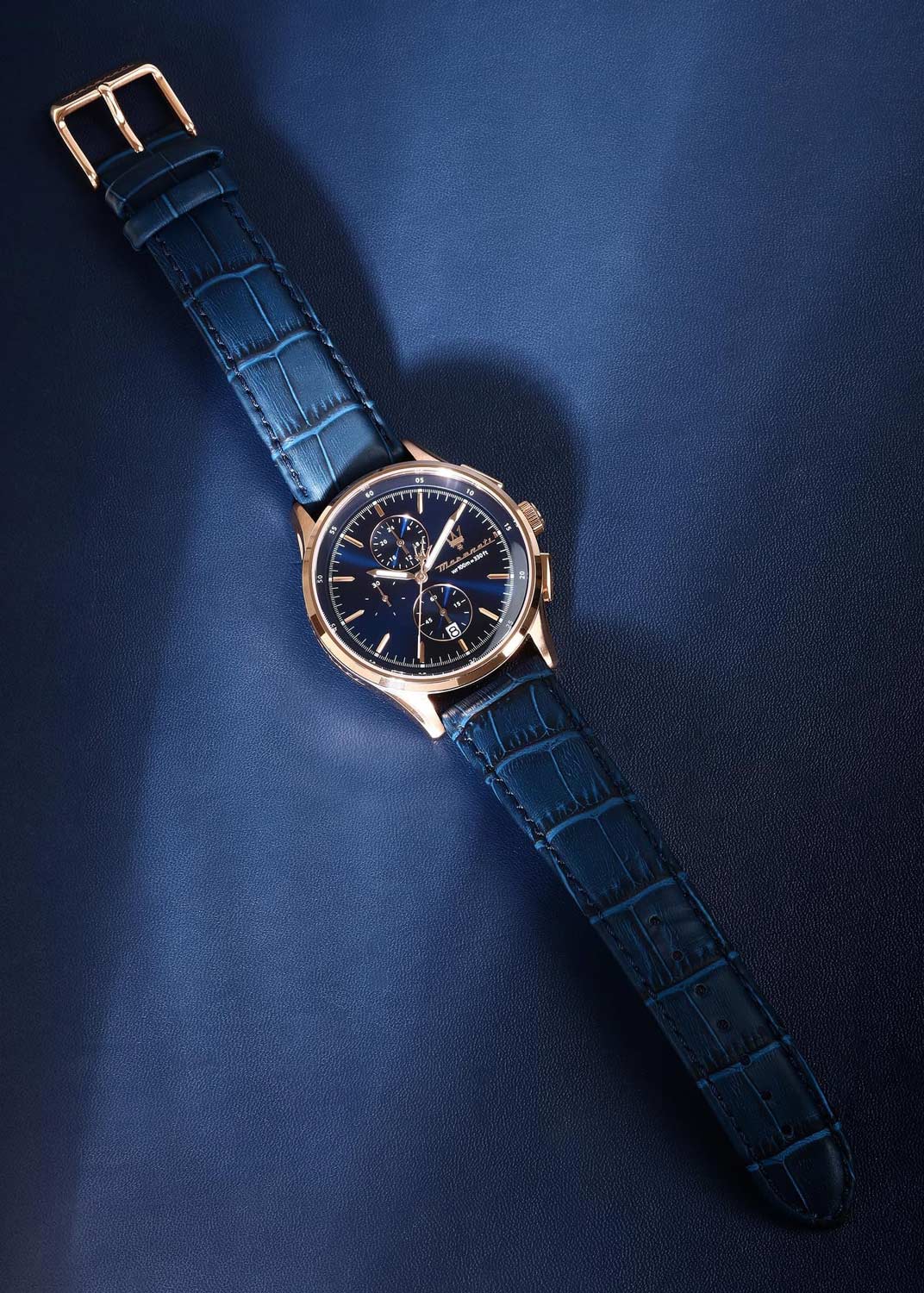Часы-хронограф с секундомером. 12-ти и 24-х часовой формат времени. Круглый стальной корпус. Циферблат выполнен по технологии Sunray (солнечные лучи) и украшен фирменным логотипом ''Maserati''.