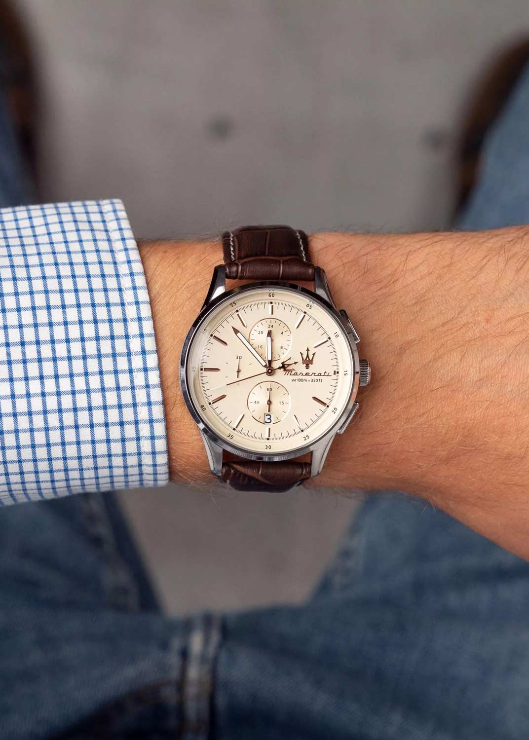 Часы-хронограф с секундомером. 12-ти и 24-х часовой формат времени. Круглый стальной корпус. Циферблат украшен фирменным логотипом ''Maserati''. Метки в виде штрихов.