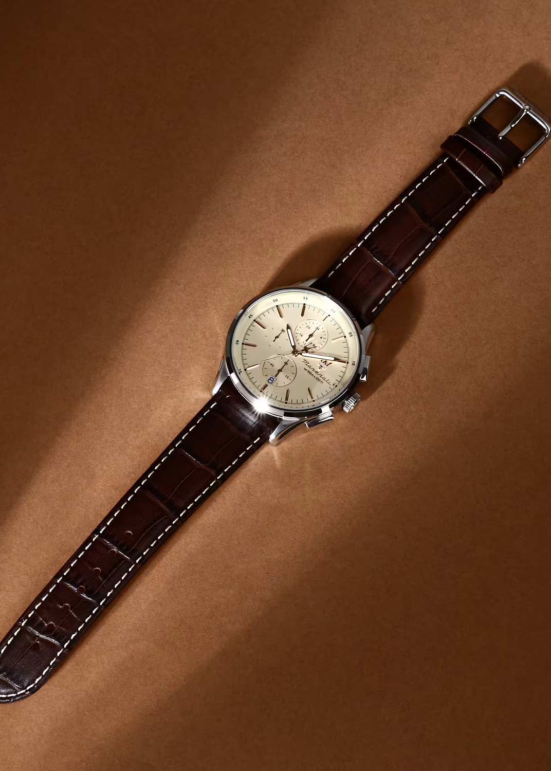 Окошко даты находится в положении 6 часов. Рифленая заводная головка. Завинчивающаяся задняя крышка. Кожаный ремешок с классической застежкой.