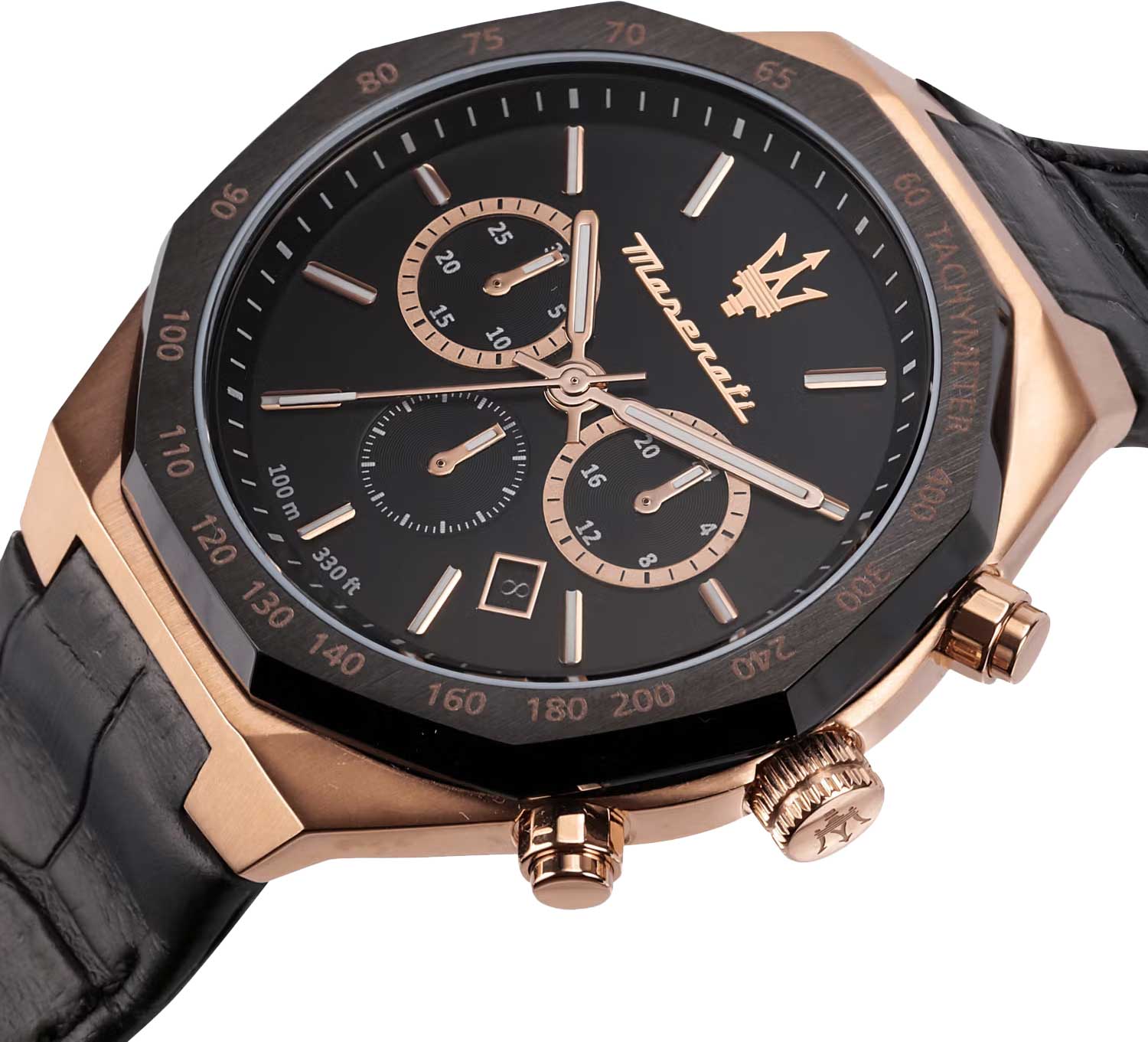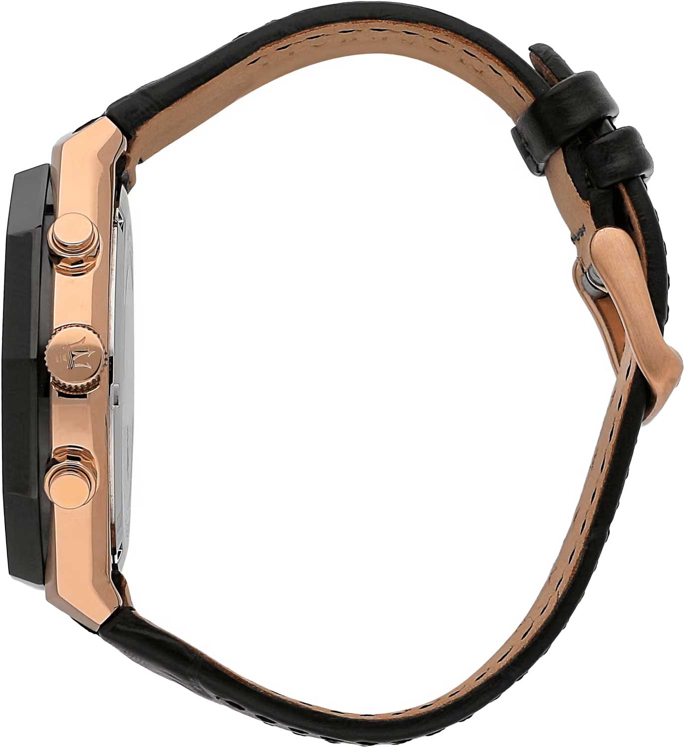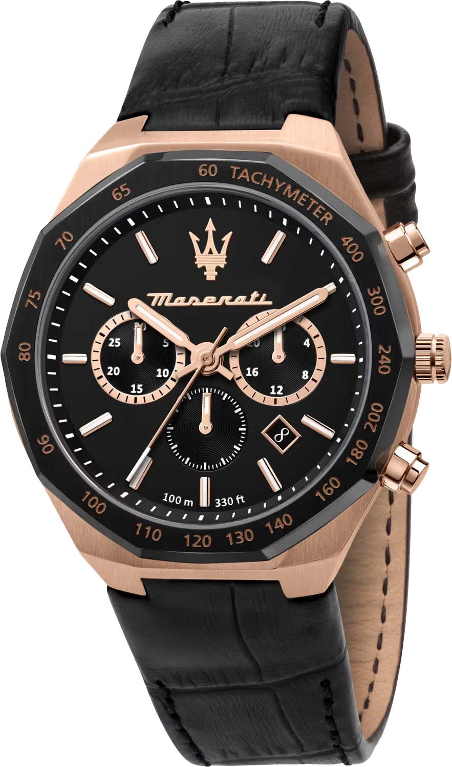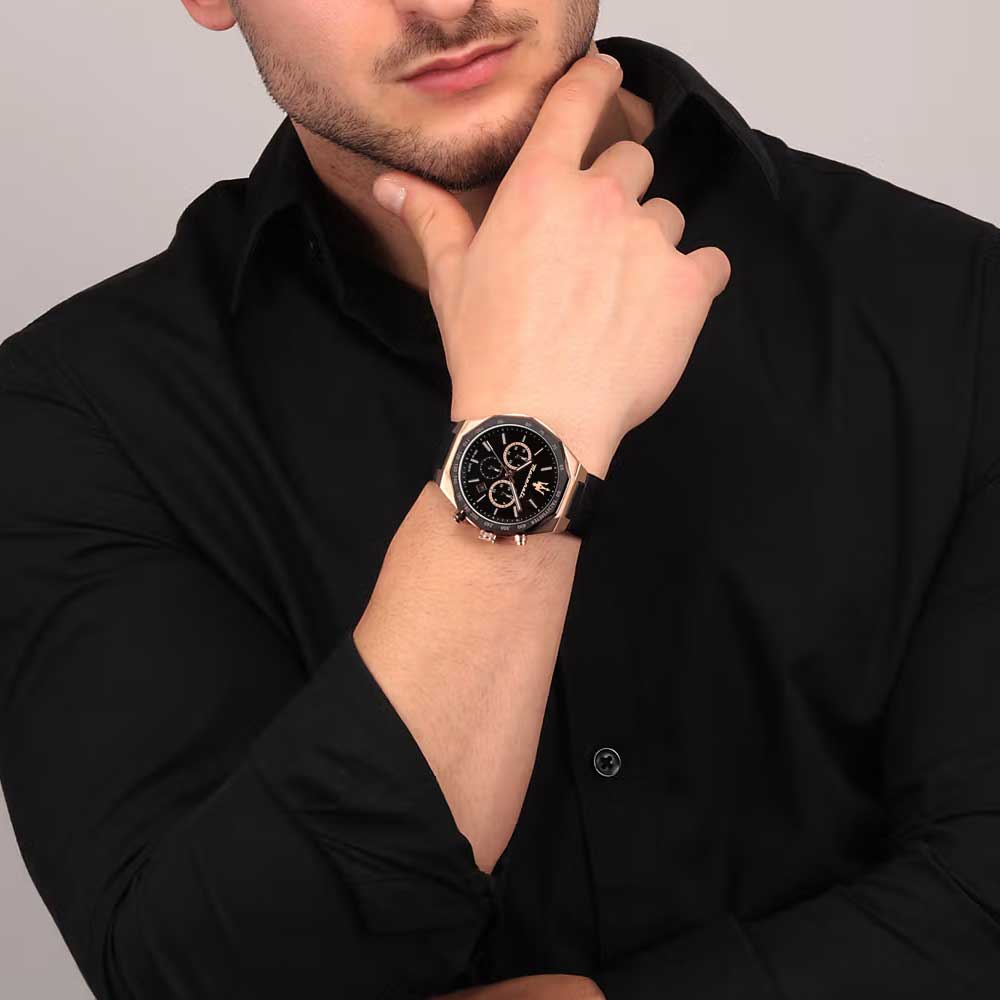 Часы-хронограф с секундомером и тахиметром. 12-ти и 24-х часовой формат времени. Циферблат с метками в виде штрихов украшен фирменным логотипом «Maserati». Окошко даты находится в положении между отметками 4 и 5 часов. Завинчивающаяся задняя крышка и заводная головка. Ремешок с классической застежкой.