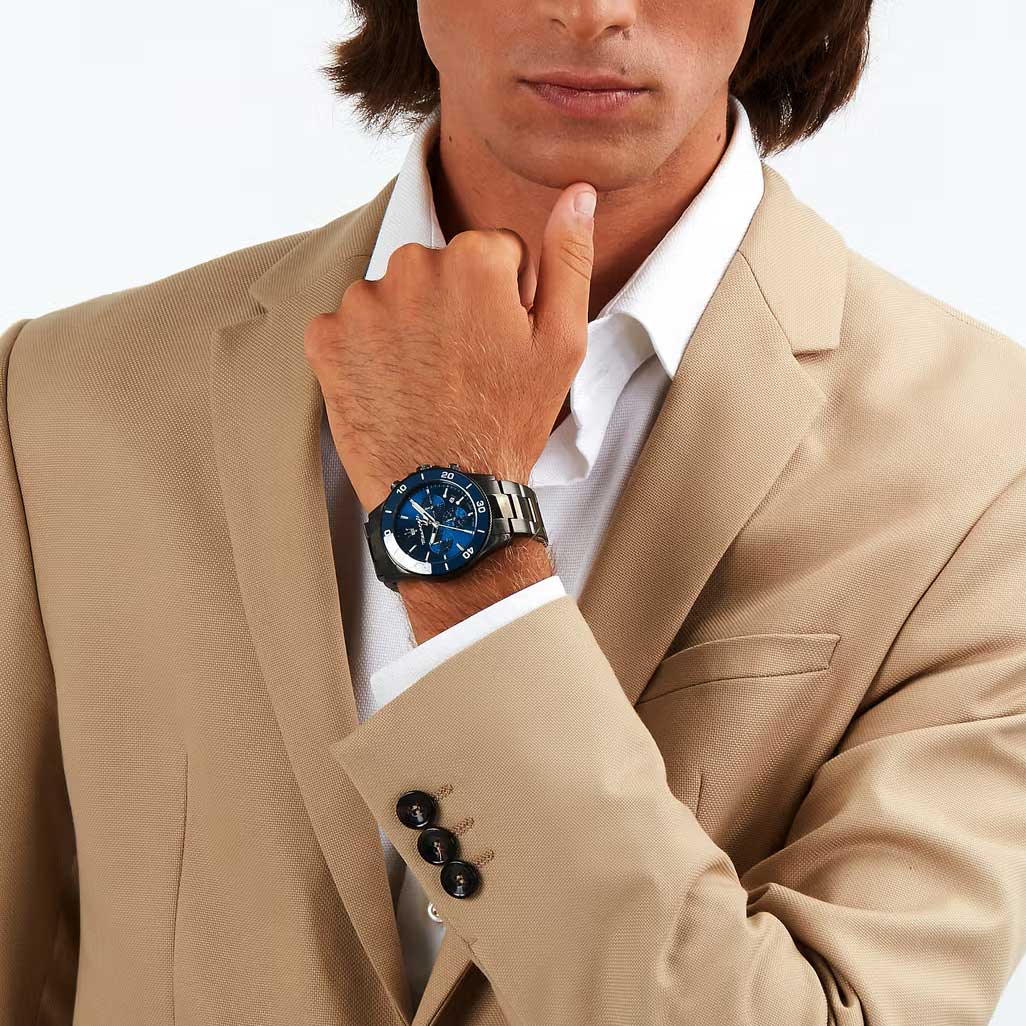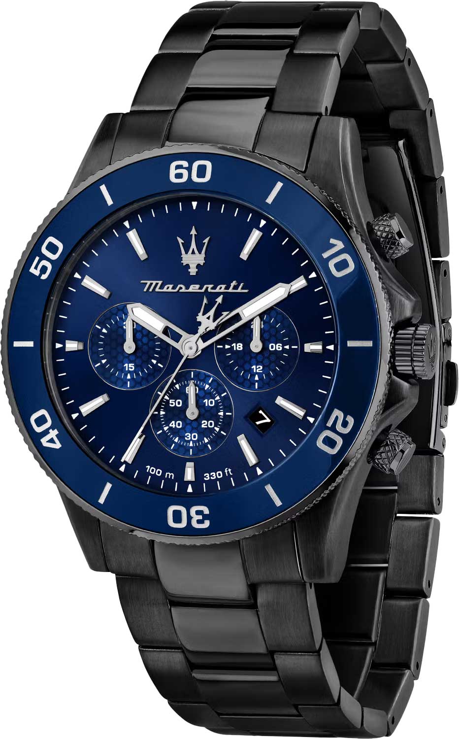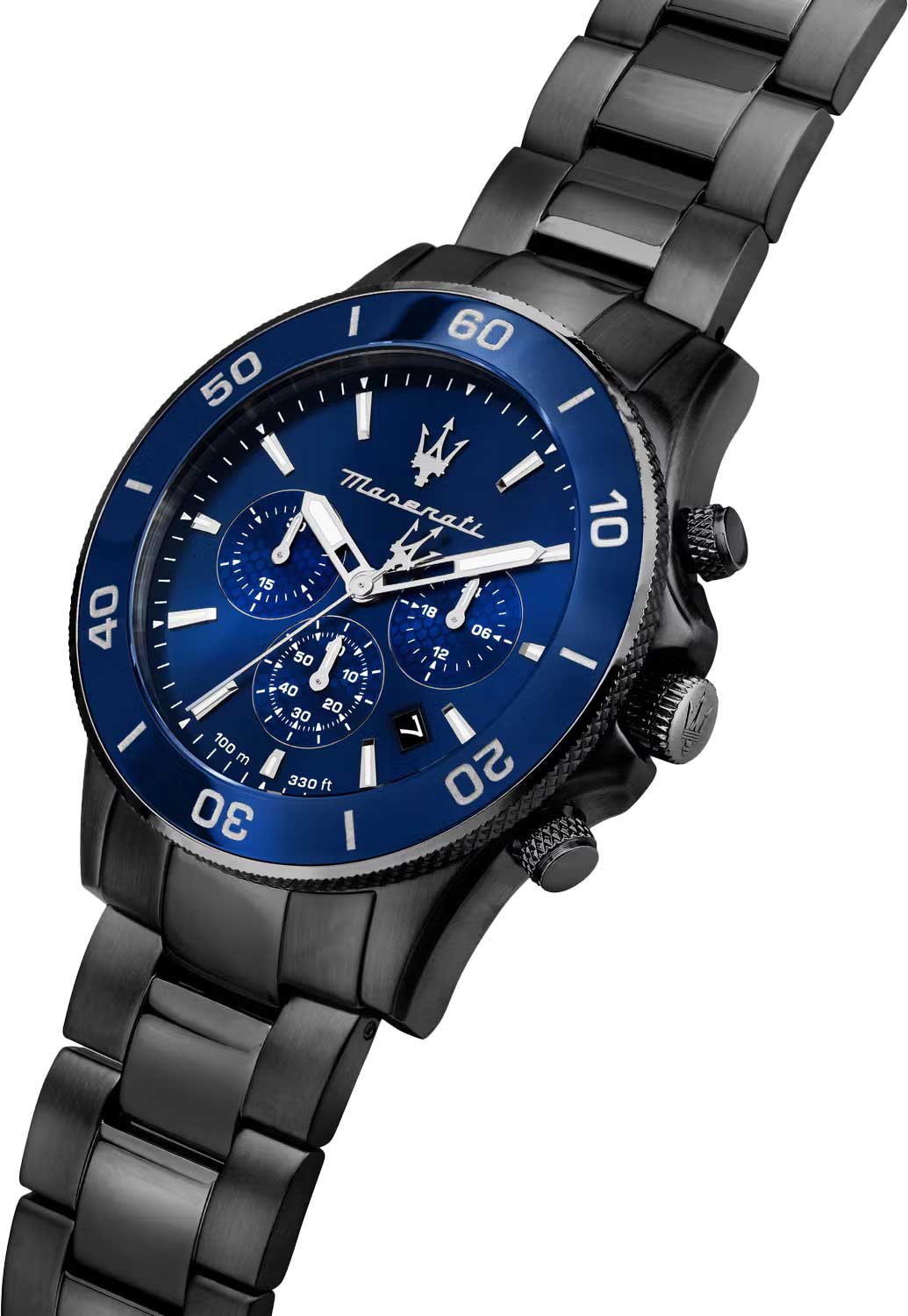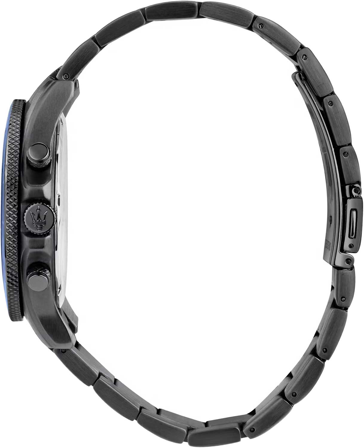Часы-хронограф с секундомером. 12-ти и 24-х часовой формат времени. Циферблат выполнен по технологии Sunray (солнечные лучи) и украшен фирменным логотипом «Maserati». Метки в виде штрихов. Окошко даты находится в положении между отметками 4 и 5 часов. Безель с керамической вставкой. Завинчивающаяся задняя крышка и заводная головка с защитой. Браслет с раскладывающейся застежкой.