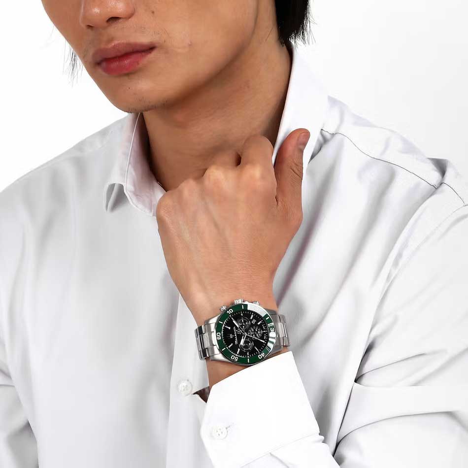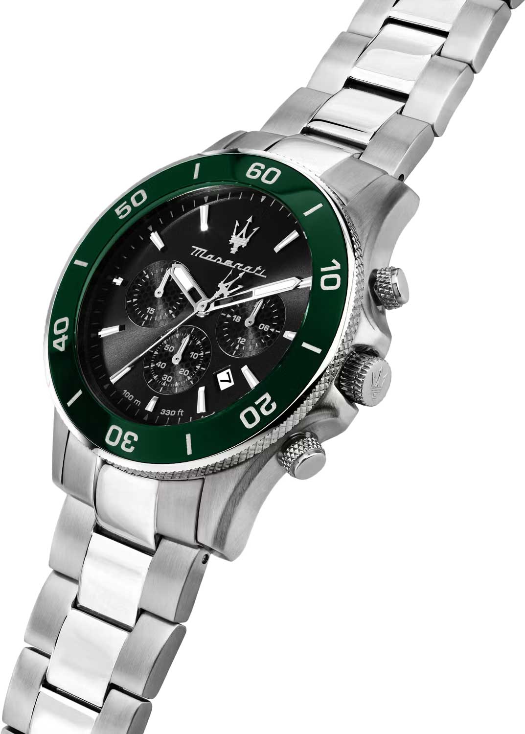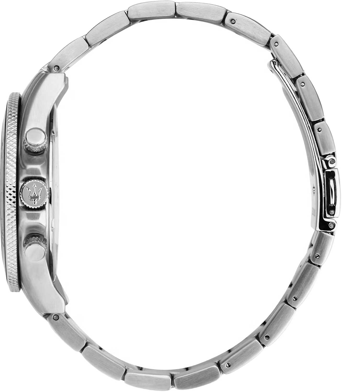 Часы-хронограф с секундомером. 12-ти и 24-х часовой формат времени. Циферблат выполнен по технологии Sunray (солнечные лучи) и украшен фирменным логотипом «Maserati». Метки в виде штрихов. Окошко даты находится в положении между отметками 4 и 5 часов. Безель с керамической вставкой. Завинчивающаяся задняя крышка и заводная головка с защитой. Браслет с раскладывающейся застежкой.