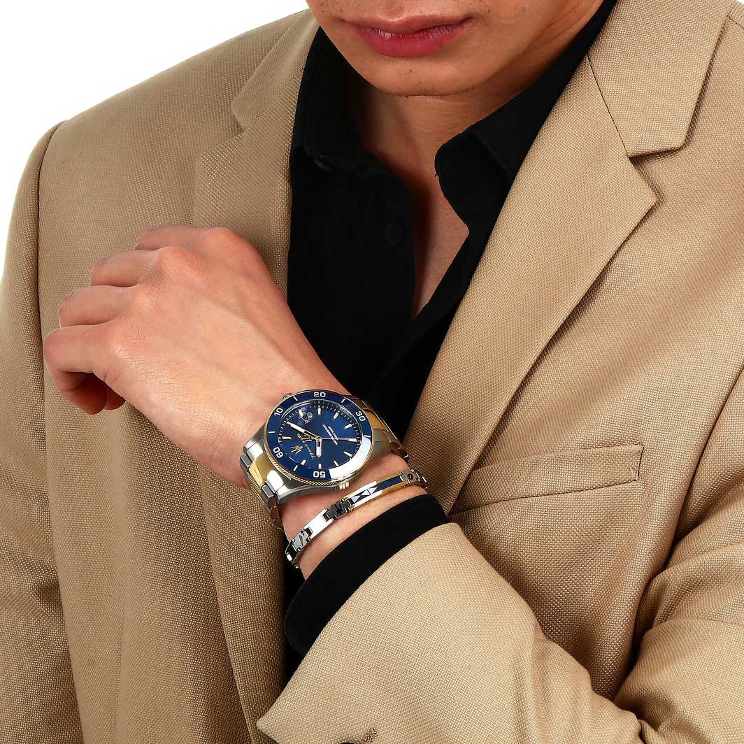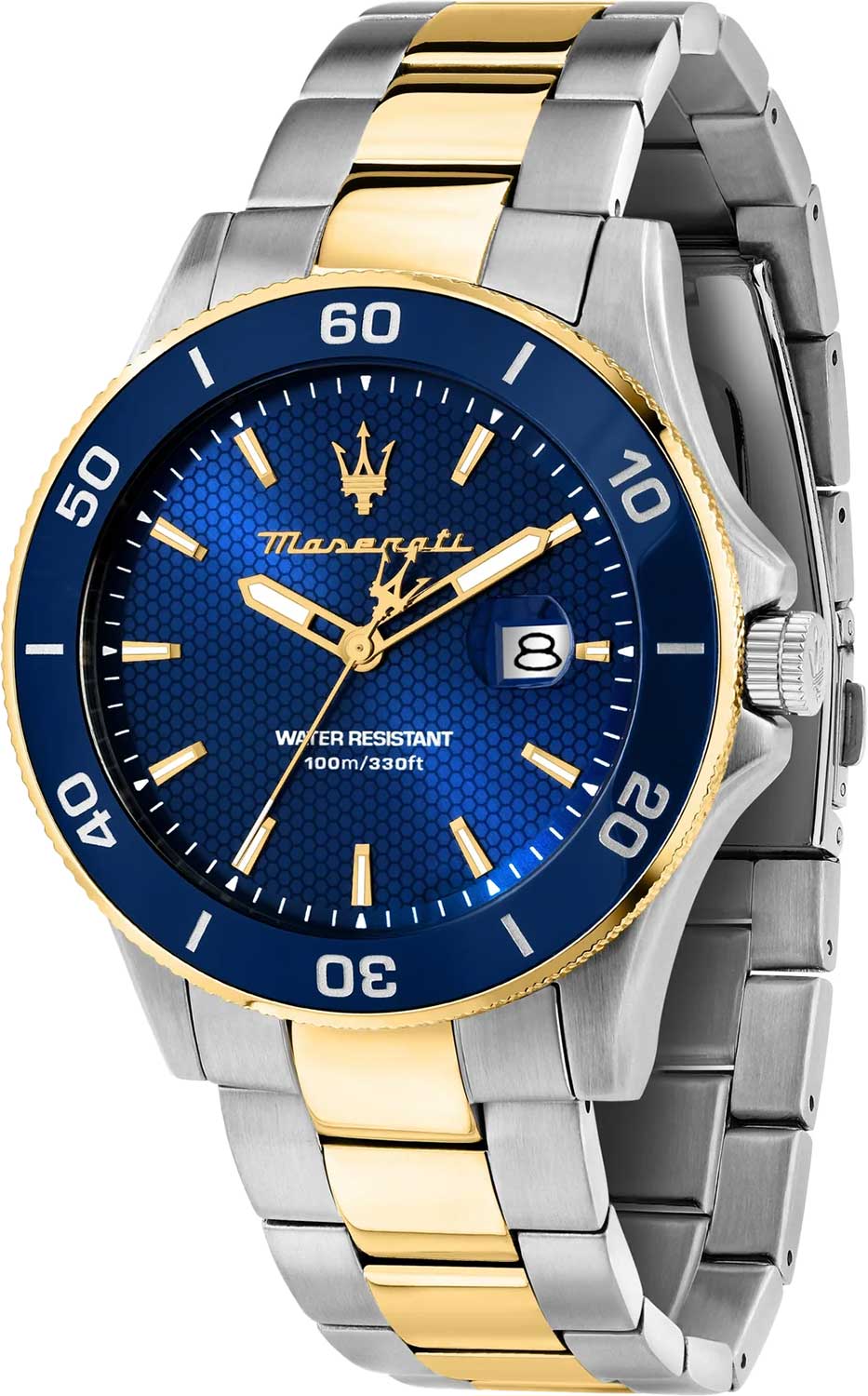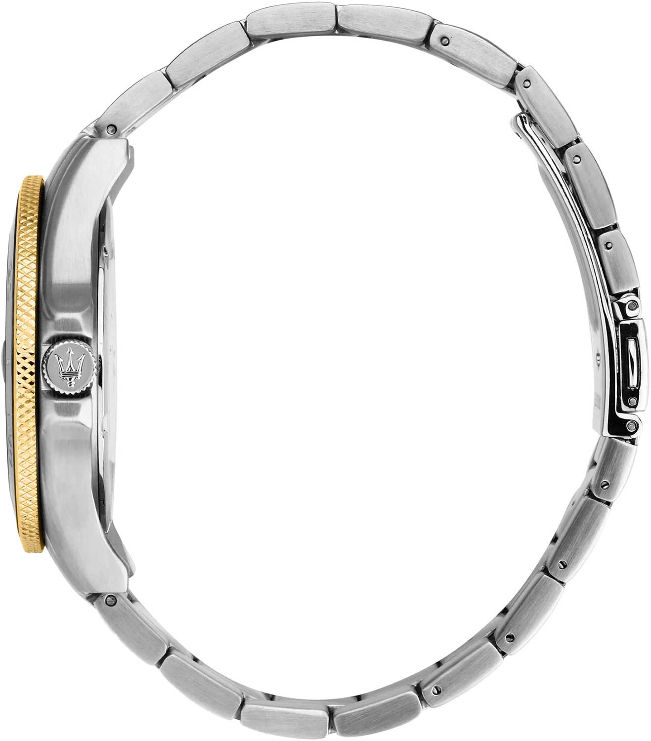 Мужские часы с круглым стальным корпусом. Циферблат выполнен по технологии Sunray (солнечные лучи) и украшен фирменным логотипом «Maserati». Метки в виде штрихов. Окошко даты с увеличительным стеклом находится в положении 3 часа. Безель с керамической вставкой. Завинчивающаяся задняя крышка и заводная головка с защитой. Браслет с раскладывающейся застежкой.