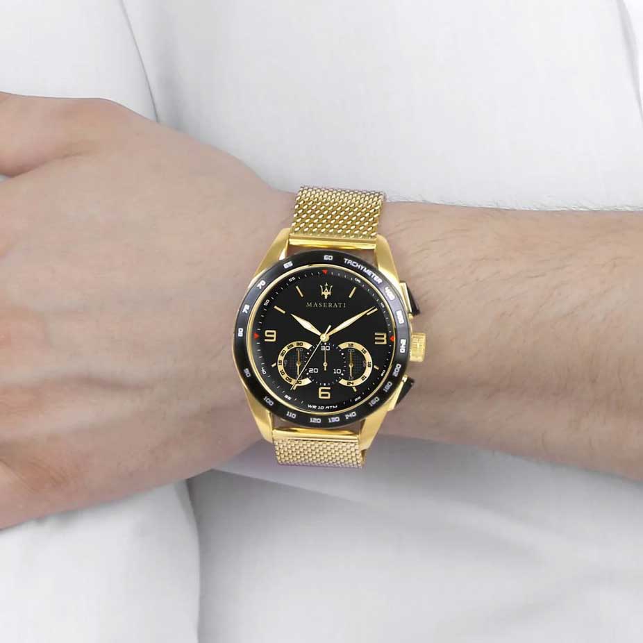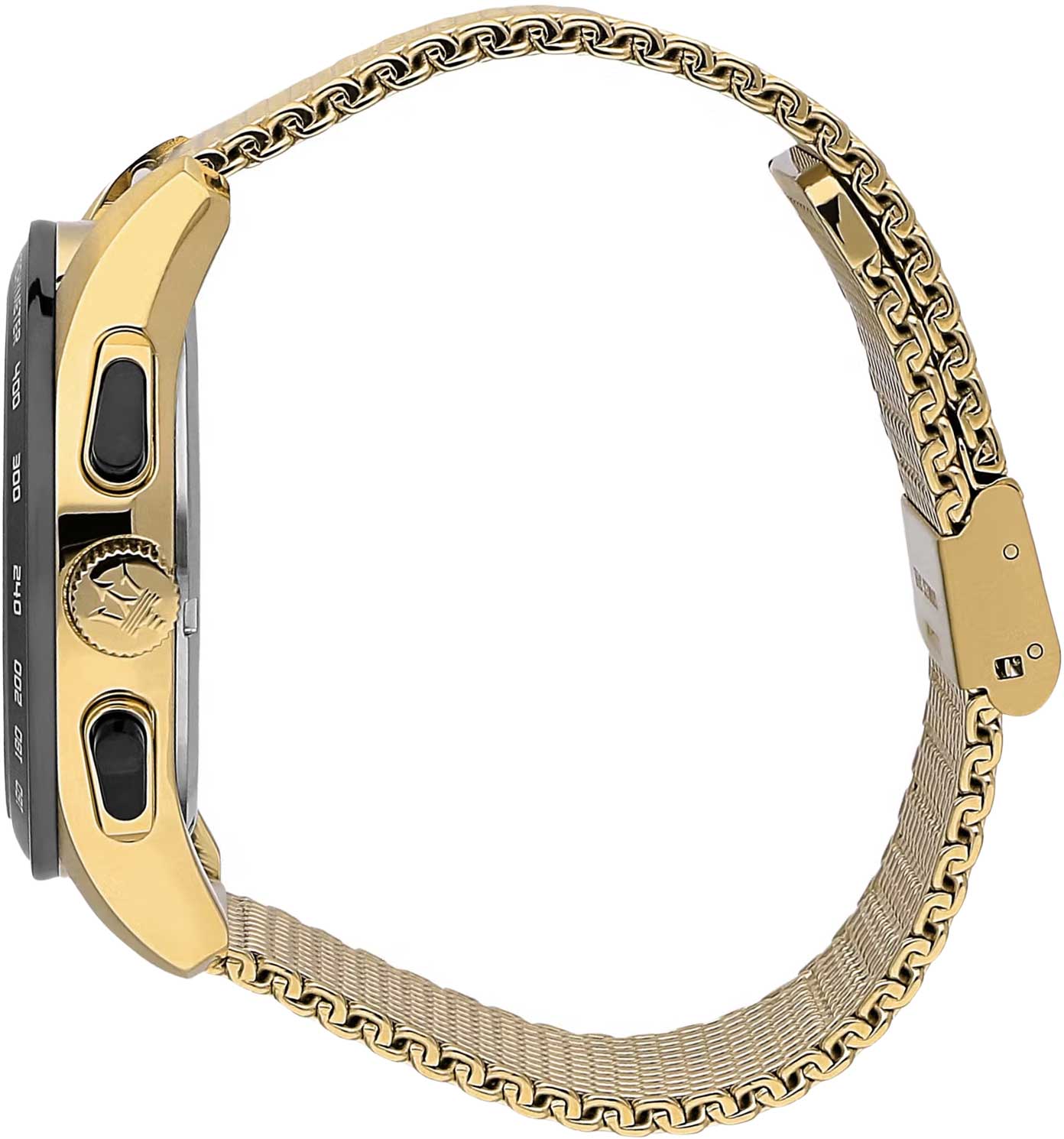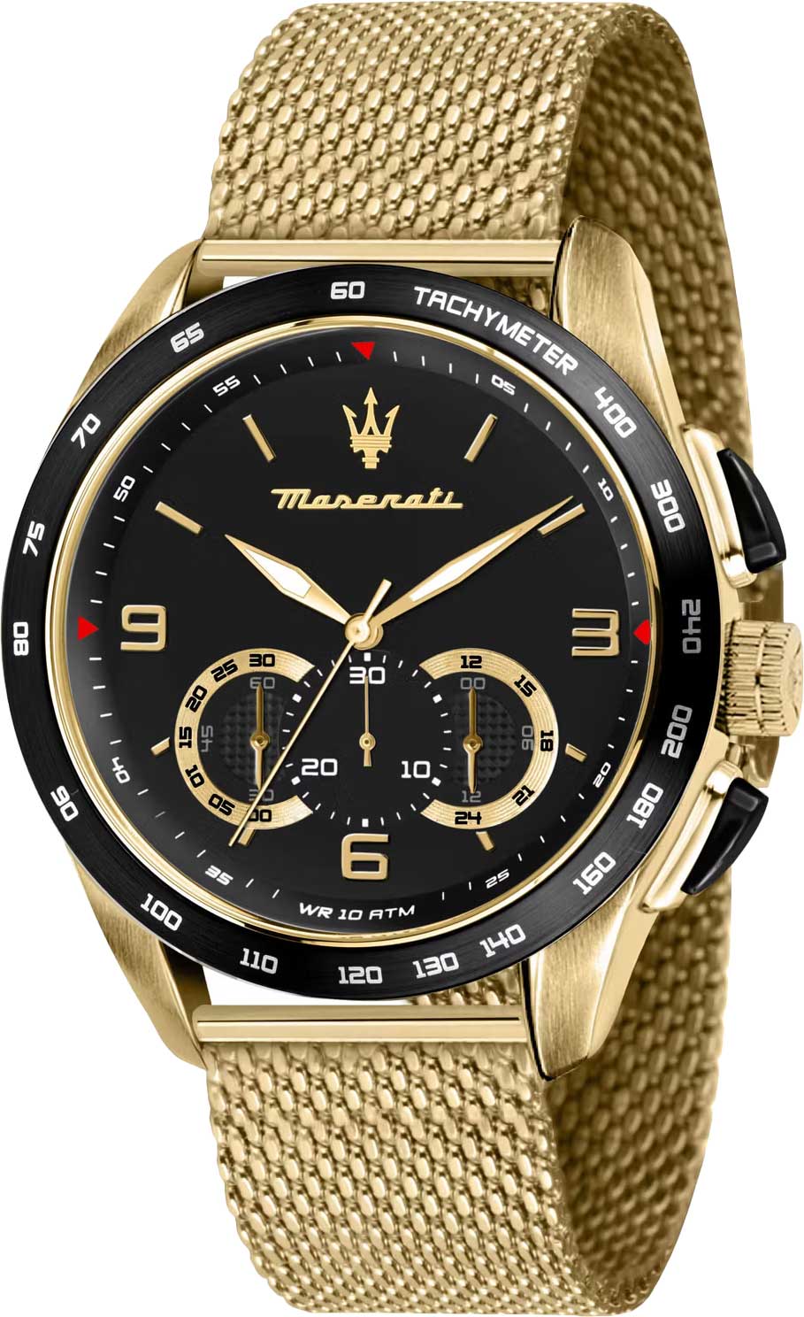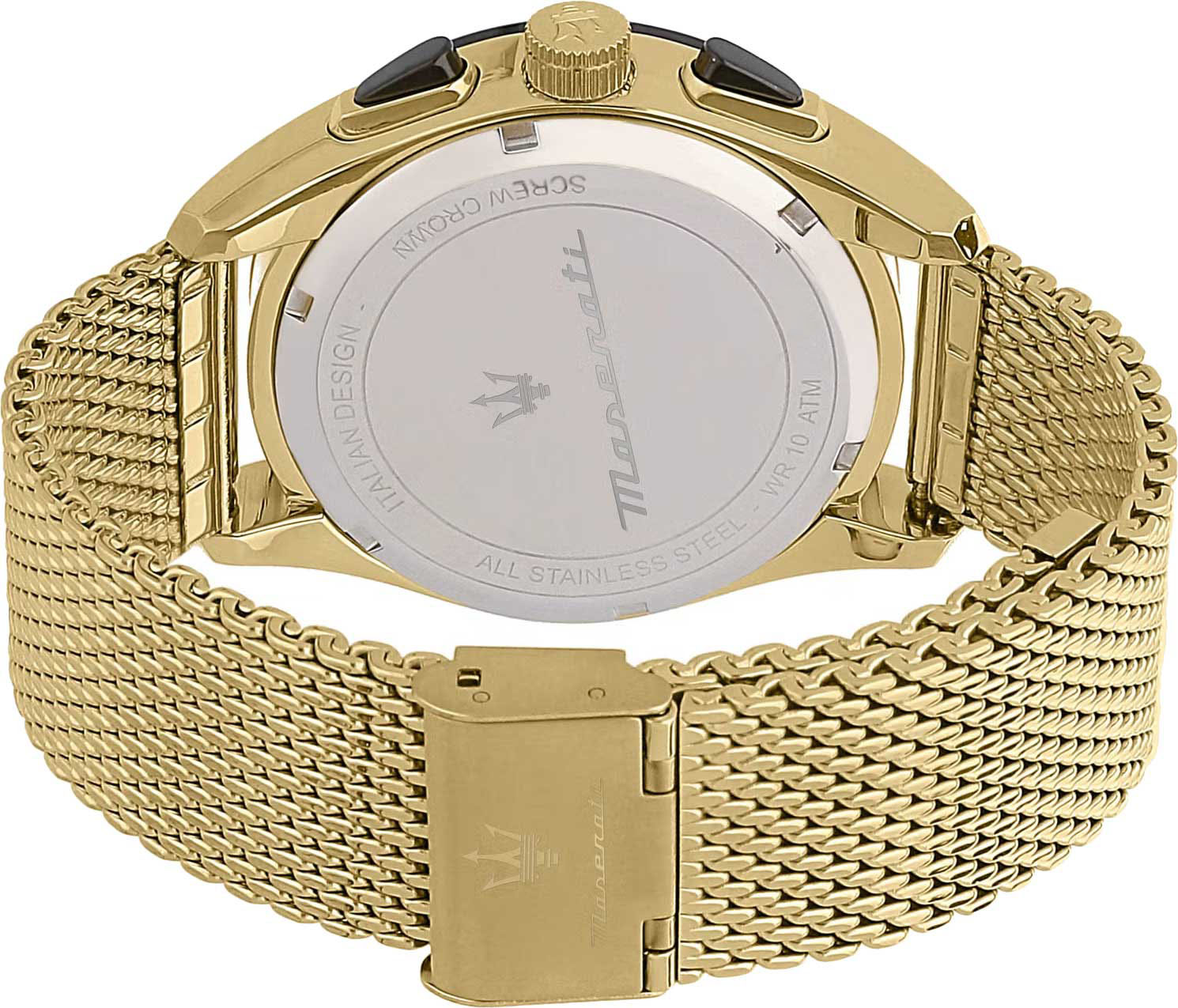 Часы-хронограф с секундомером до 30мин и тахиметром. 12-ти и 24-х часовой формат времени. Циферблат украшен фирменным логотипом «Maserati». Метки в виде штрихов и арабских цифр. Завинчивающаяся задняя крышка и заводная головка. Браслет миланского плетения с регулируемой застежкой.