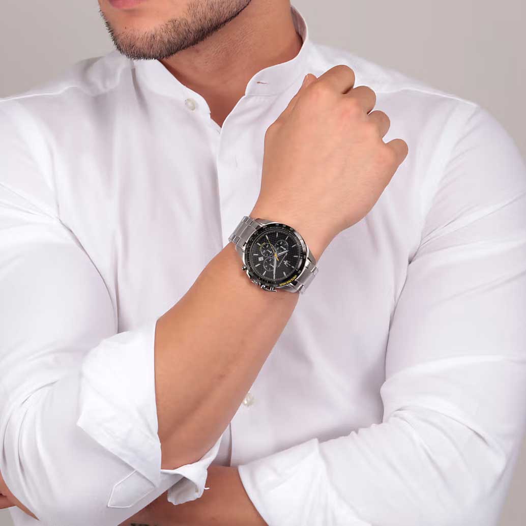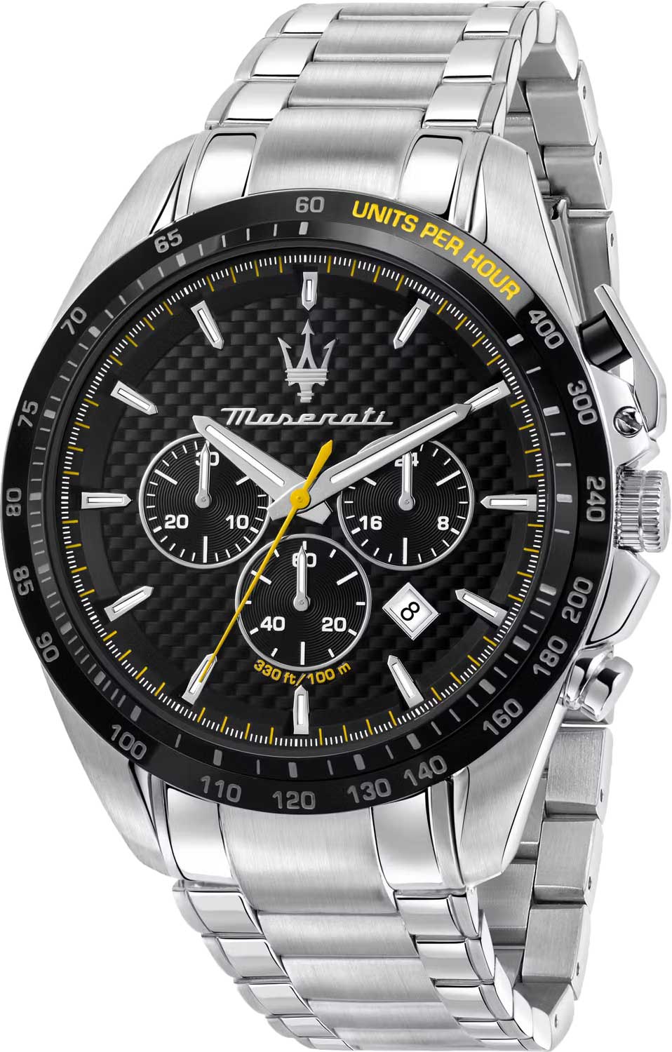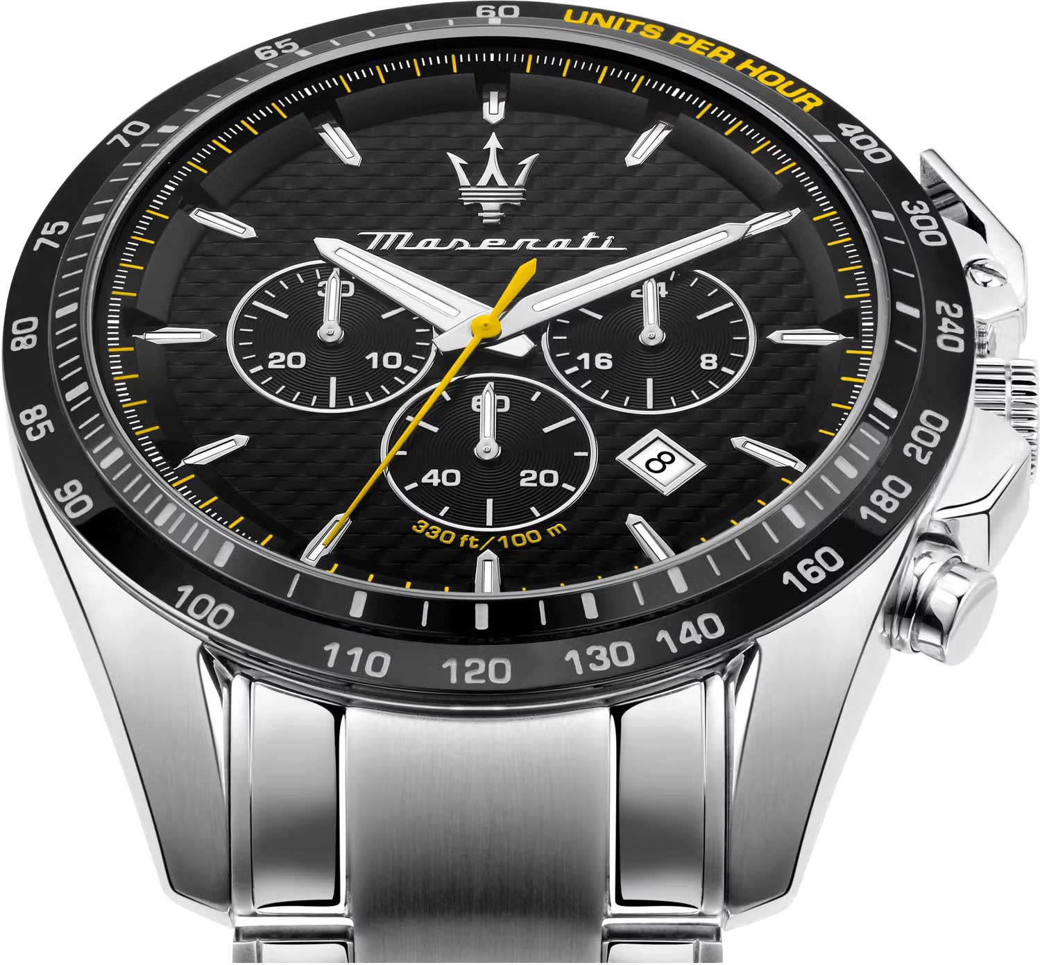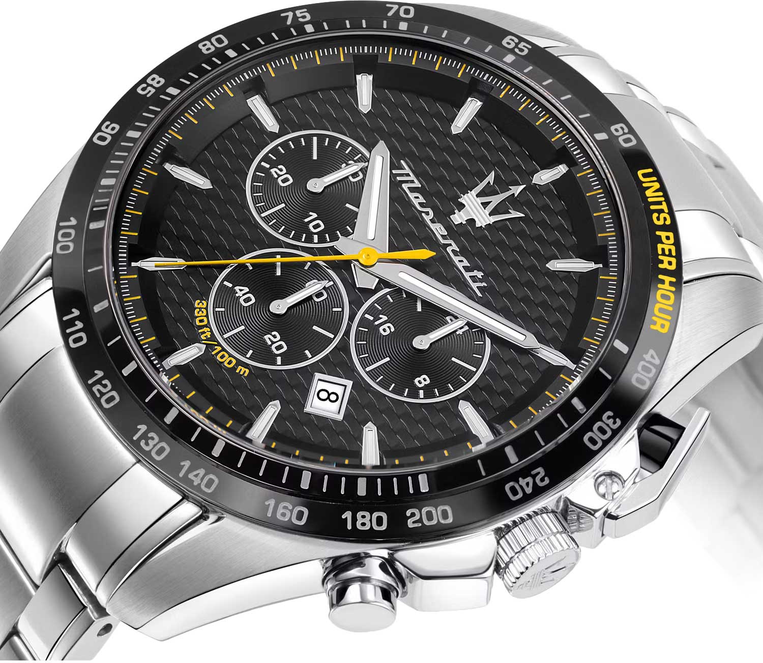 Часы-хронограф с секундомером и тахиметром. 12-ти и 24-х часовой формат времени. Циферблат с метками в виде штрихов украшен фирменным логотипом «Maserati». Окошко даты находится в положении между отметками 4 и 5 часов. Завинчивающаяся задняя крышка и заводная головка с защитой. Браслет с раскладывающейся застежкой.