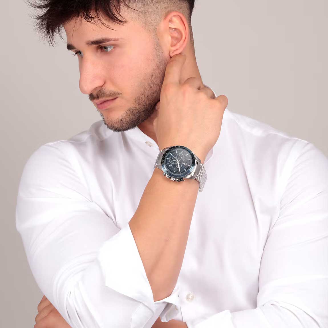 Часы-хронограф с секундомером и тахиметром. 12-ти и 24-х часовой формат времени. Циферблат с метками в виде штрихов украшен фирменным логотипом «Maserati». Окошко даты находится в положении между отметками 4 и 5 часов. Завинчивающаяся задняя крышка и заводная головка с защитой. Браслет с раскладывающейся застежкой.