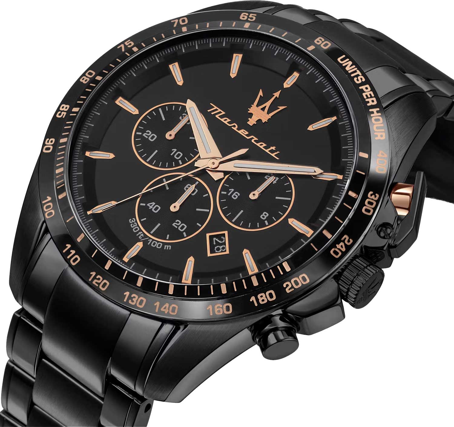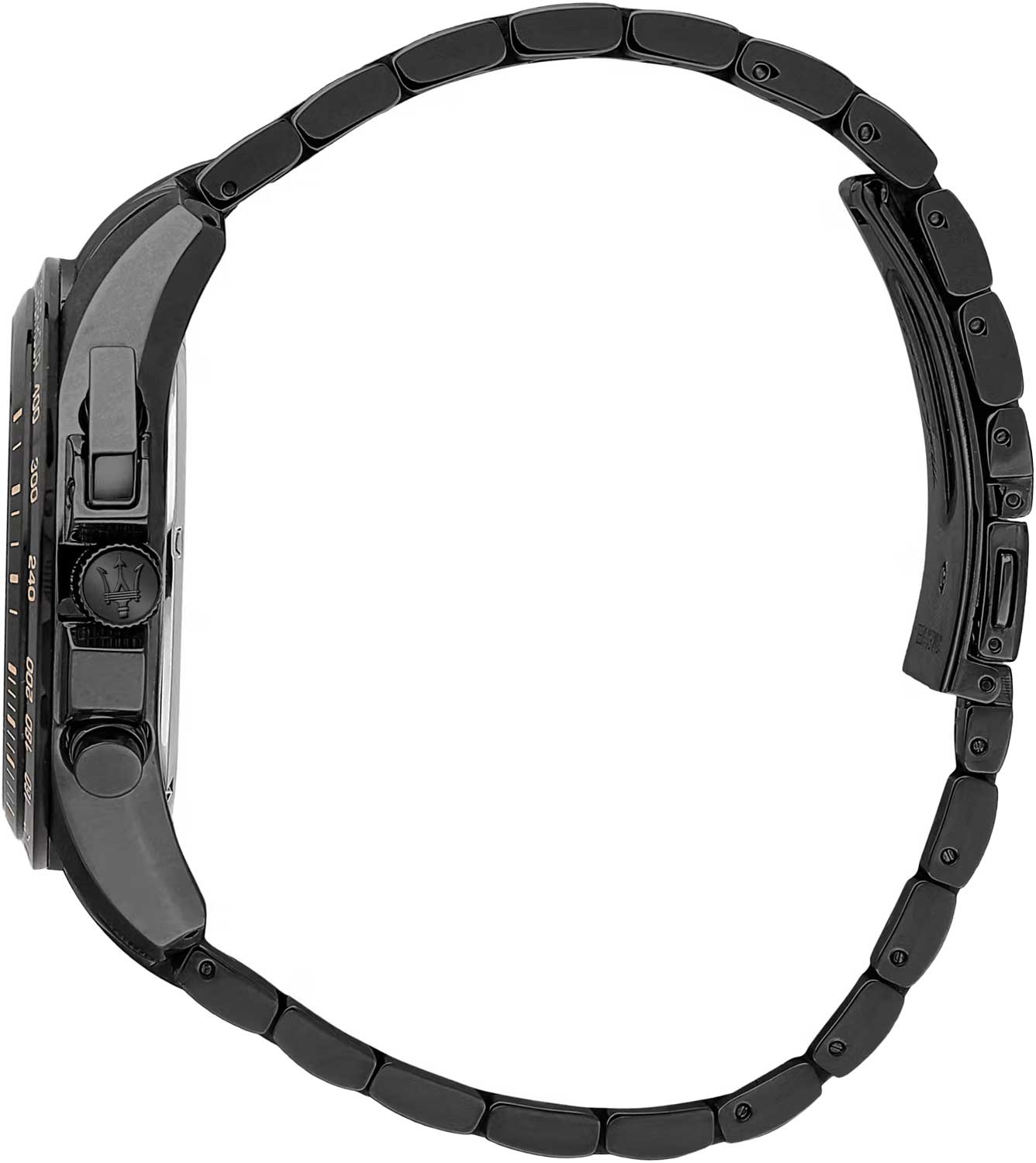 Часы-хронограф с секундомером и тахиметром. 12-ти и 24-х часовой формат времени. Циферблат выполнен по технологии Sunray (солнечные лучи) и украшен фирменным логотипом «Maserati». Метки в виде штрихов. Окошко даты находится в положении между отметками 4 и 5 часов. Завинчивающаяся задняя крышка и заводная головка с защитой. Браслет с раскладывающейся застежкой.