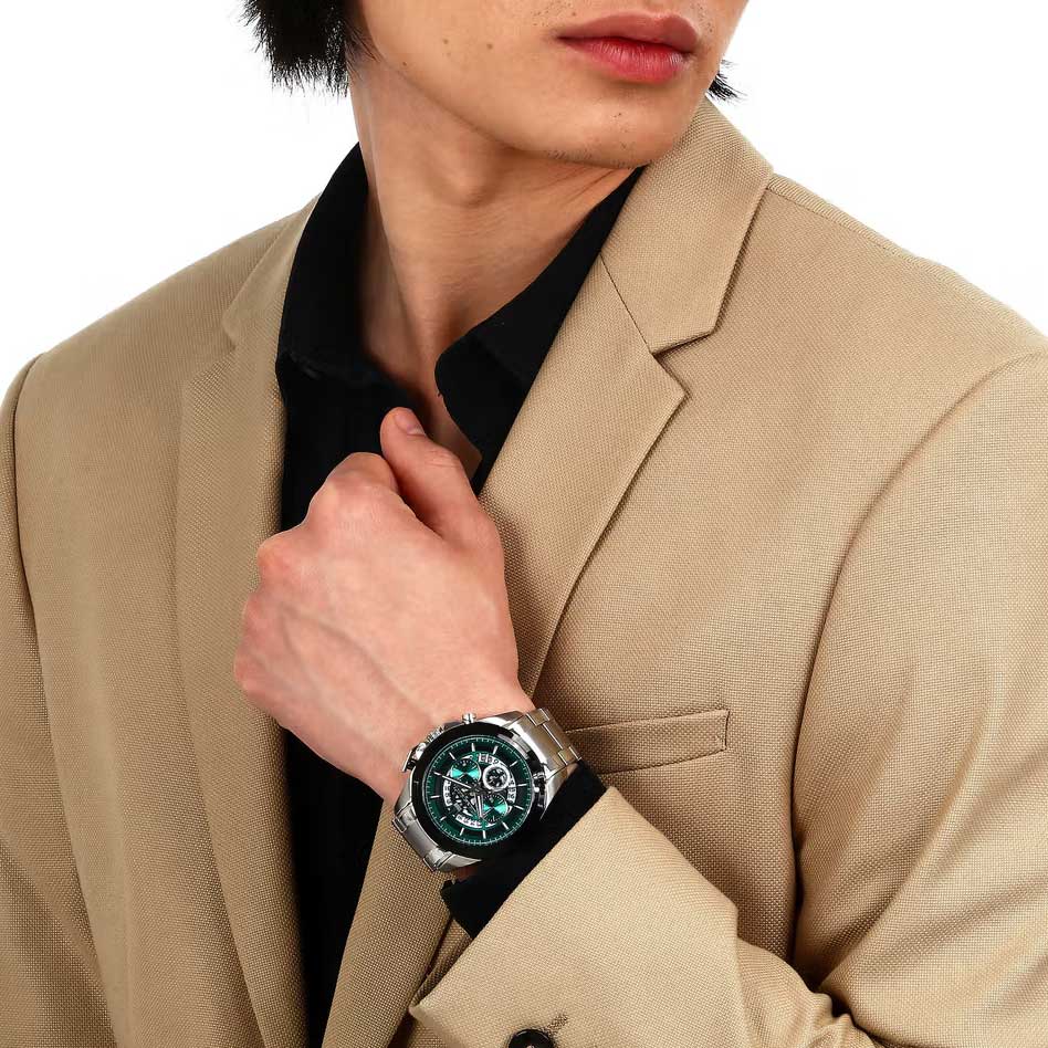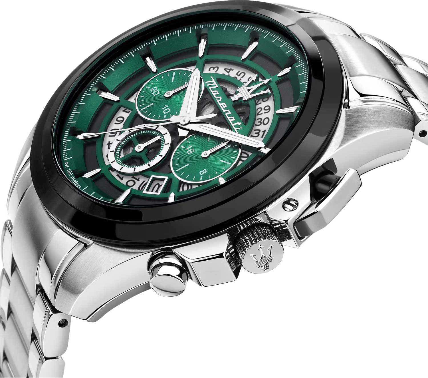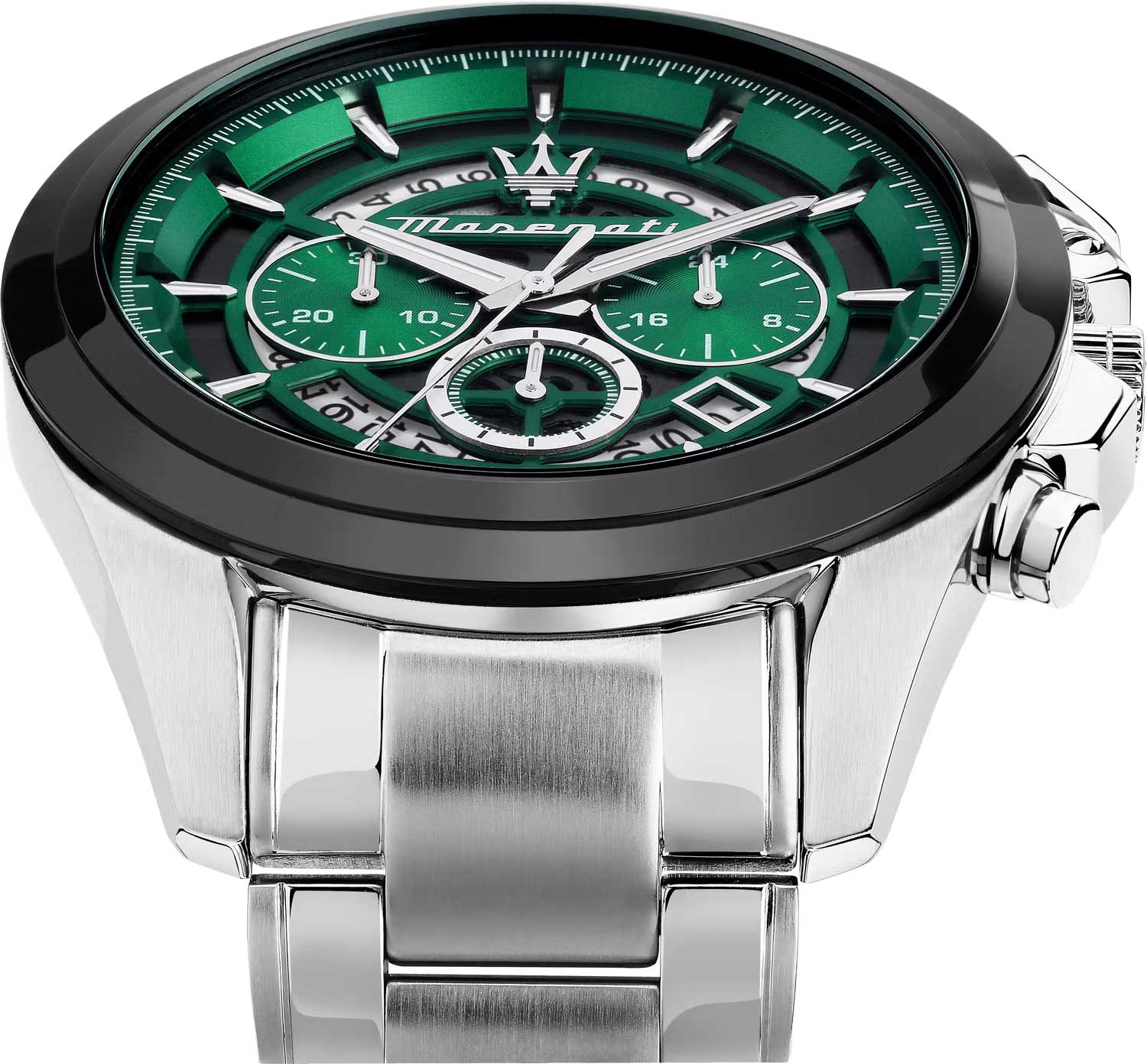 Скелетонизированные часы-хронограф с секундомером. 12-ти и 24-х часовой формат времени. Циферблат выполнен по технологии Sunray (солнечные лучи) и украшен фирменным логотипом «Maserati». Метки в виде штрихов. Окошко даты находится в положении между отметками 4 и 5 часов. Завинчивающаяся задняя крышка и заводная головка с защитой. Браслет с раскладывающейся застежкой.