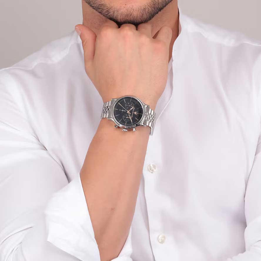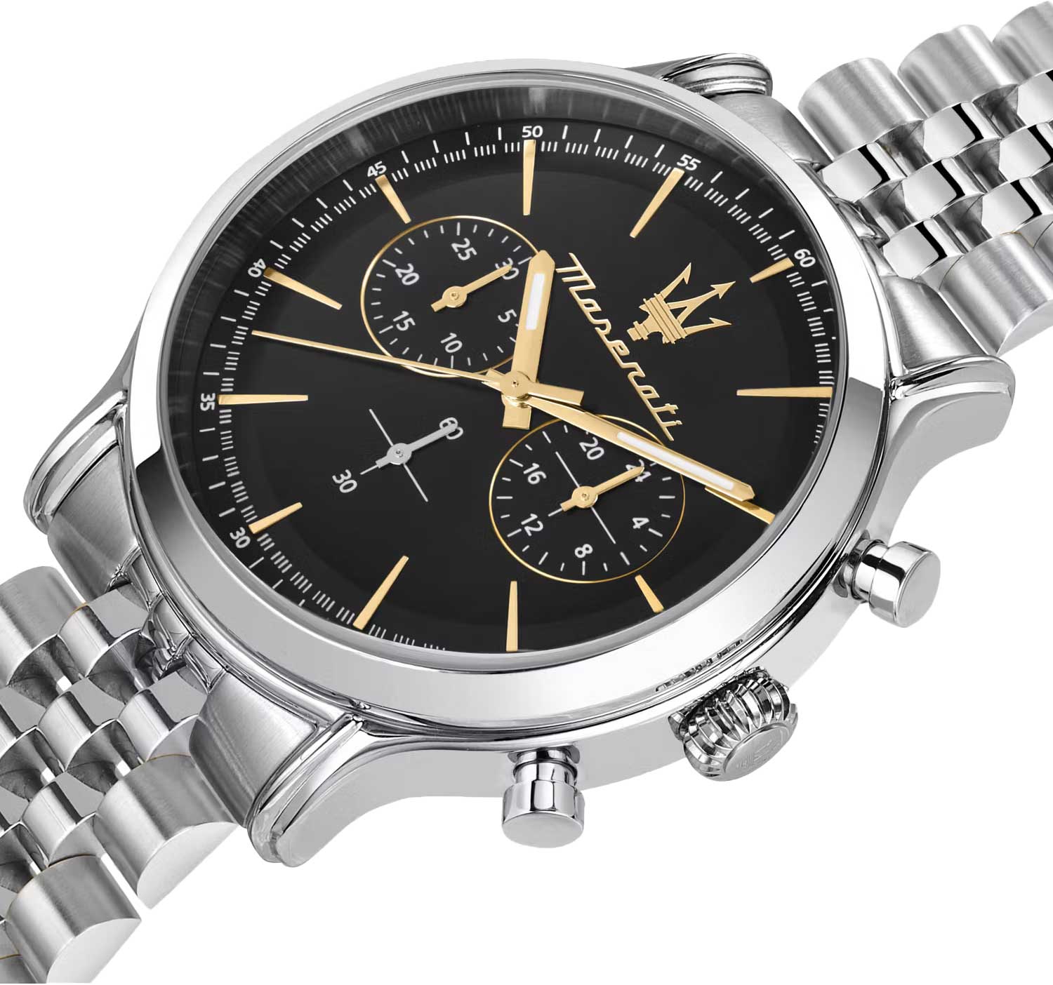Часы-хронограф с секундомером. 12-ти и 24-х часовой формат времени. Циферблат с метками в виде штрихов украшен фирменным логотипом «Maserati». Завинчивающаяся задняя крышка и заводная головка. Браслет с раскладывающейся застежкой.