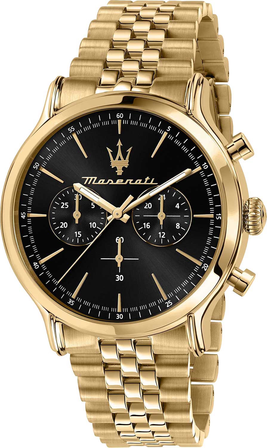 Часы-хронограф с секундомером. 12-ти и 24-х часовой формат времени. Циферблат выполнен по технологии Sunray (солнечные лучи) и украшен фирменным логотипом «Maserati». Метки в виде штрихов. Завинчивающаяся задняя крышка и заводная головка. Браслет с раскладывающейся застежкой.