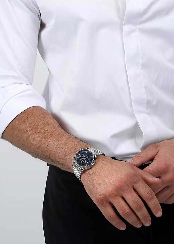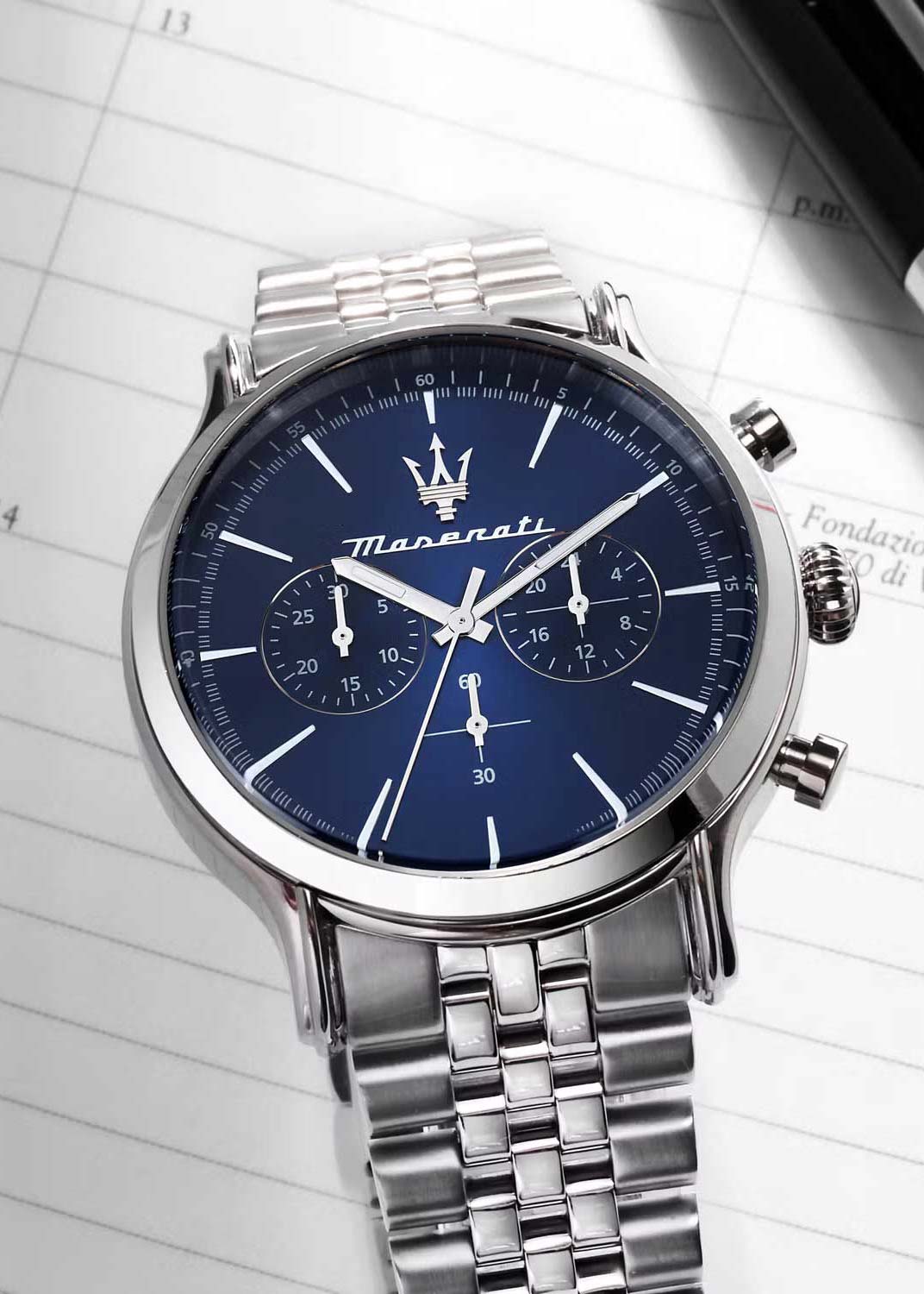 Часы-хронограф с секундомером. 12-ти и 24-х часовой формат времени. Циферблат выполнен по технологии Sunray (солнечные лучи) и украшен фирменным логотипом «Maserati». Метки в виде штрихов. Завинчивающаяся задняя крышка и заводная головка. Браслет с раскладывающейся застежкой.