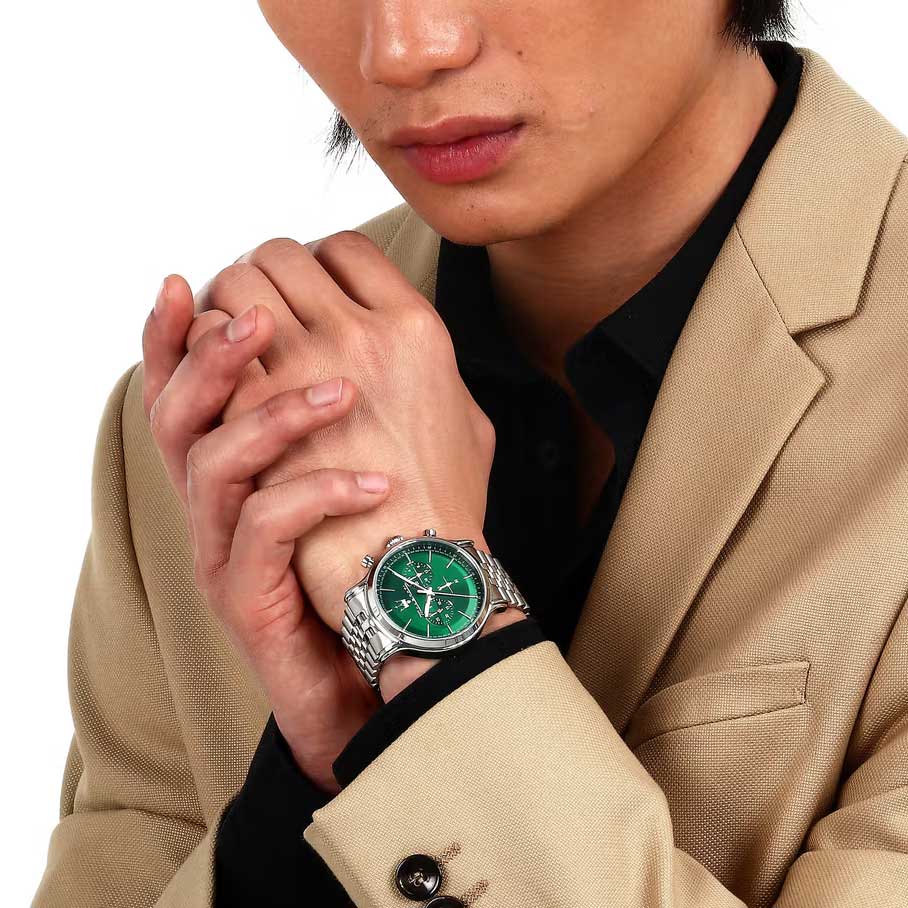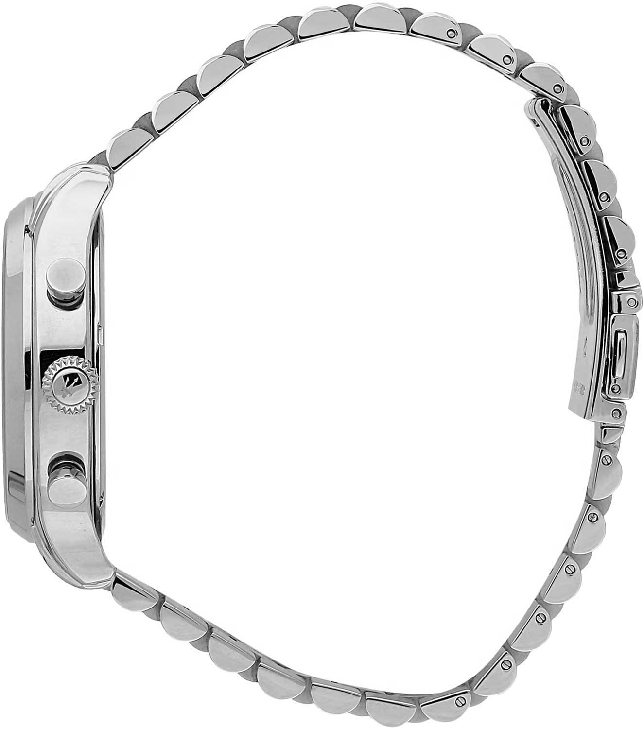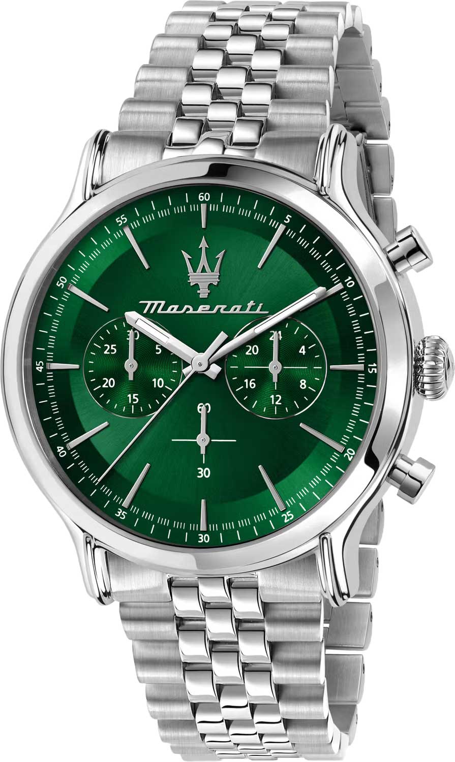 Часы-хронограф с секундомером. 12-ти и 24-х часовой формат времени. Циферблат выполнен по технологии Sunray (солнечные лучи) и украшен фирменным логотипом «Maserati». Метки в виде штрихов. Завинчивающаяся задняя крышка и заводная головка. Браслет с раскладывающейся застежкой.