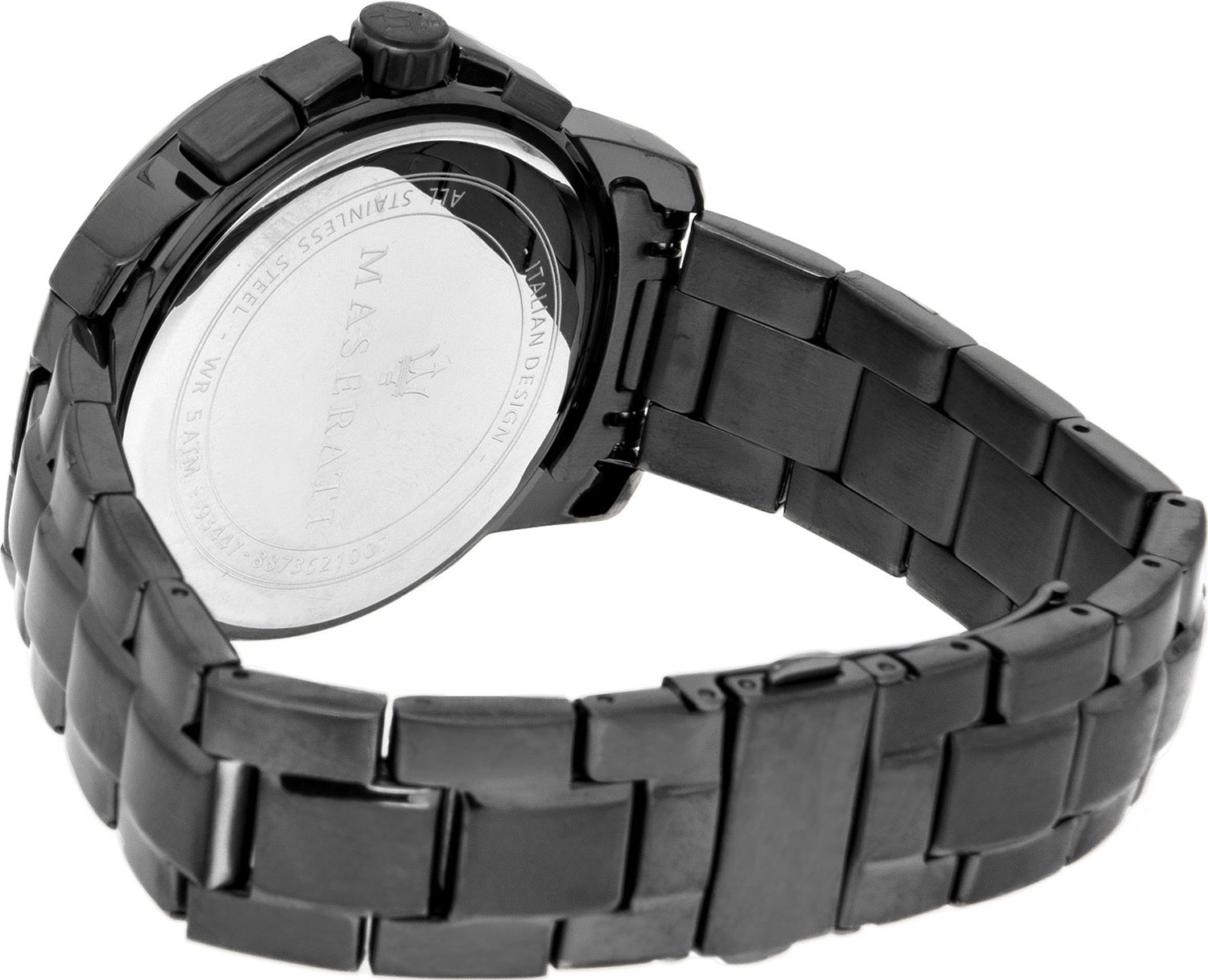 Successo. Часы-хронограф с секундомером. 12-ти и 24-х часовой формат времени. Циферблат с метками в виде штрихов украшен фирменным логотипом «Maserati». Окошко даты находится в положении между отметками 4 и 5 часов. Заводная головка с защитой. Браслет с раскладывающейся застежкой.
