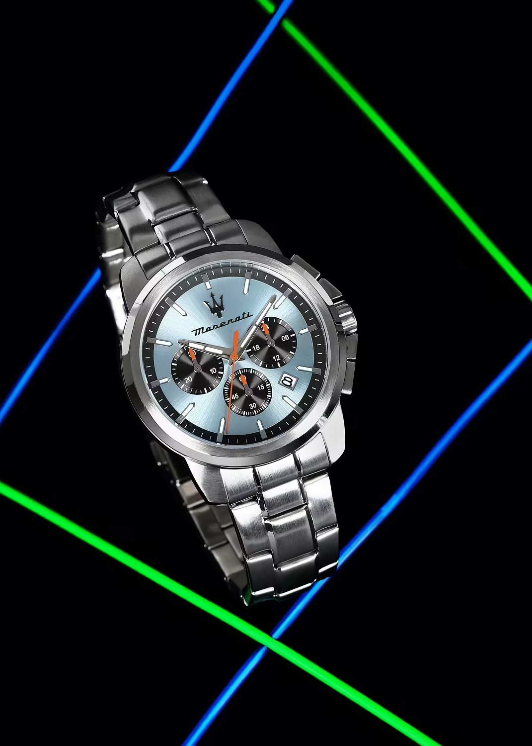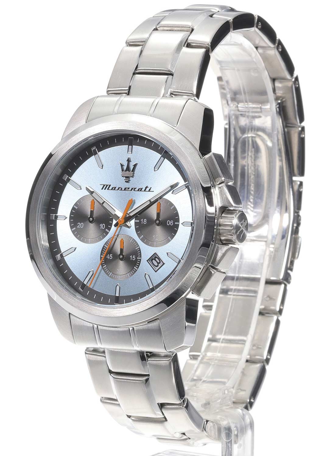 Часы-хронограф с секундомером. 12-ти и 24-х часовой формат времени. Круглый стальной корпус. Циферблат выполнен по технологии Sunray (солнечные лучи) и украшен фирменным логотипом ''Maserati''. Метки в виде штрихов.