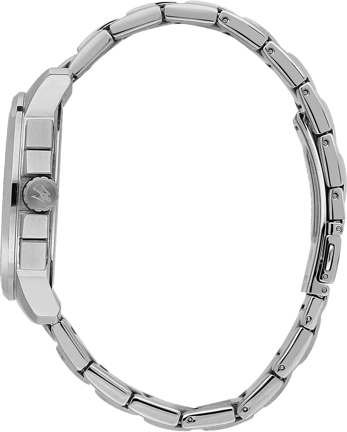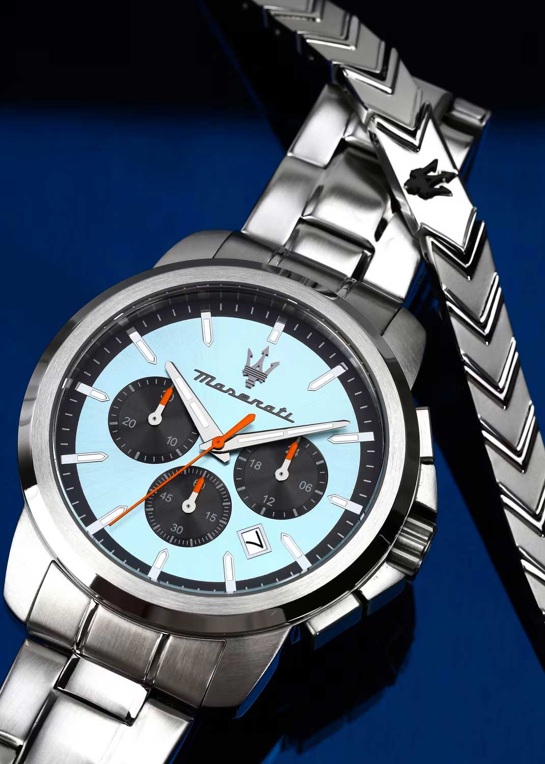 Часы-хронограф с секундомером. 12-ти и 24-х часовой формат времени. Круглый стальной корпус. Циферблат выполнен по технологии Sunray (солнечные лучи) и украшен фирменным логотипом ''Maserati''. Метки в виде штрихов.