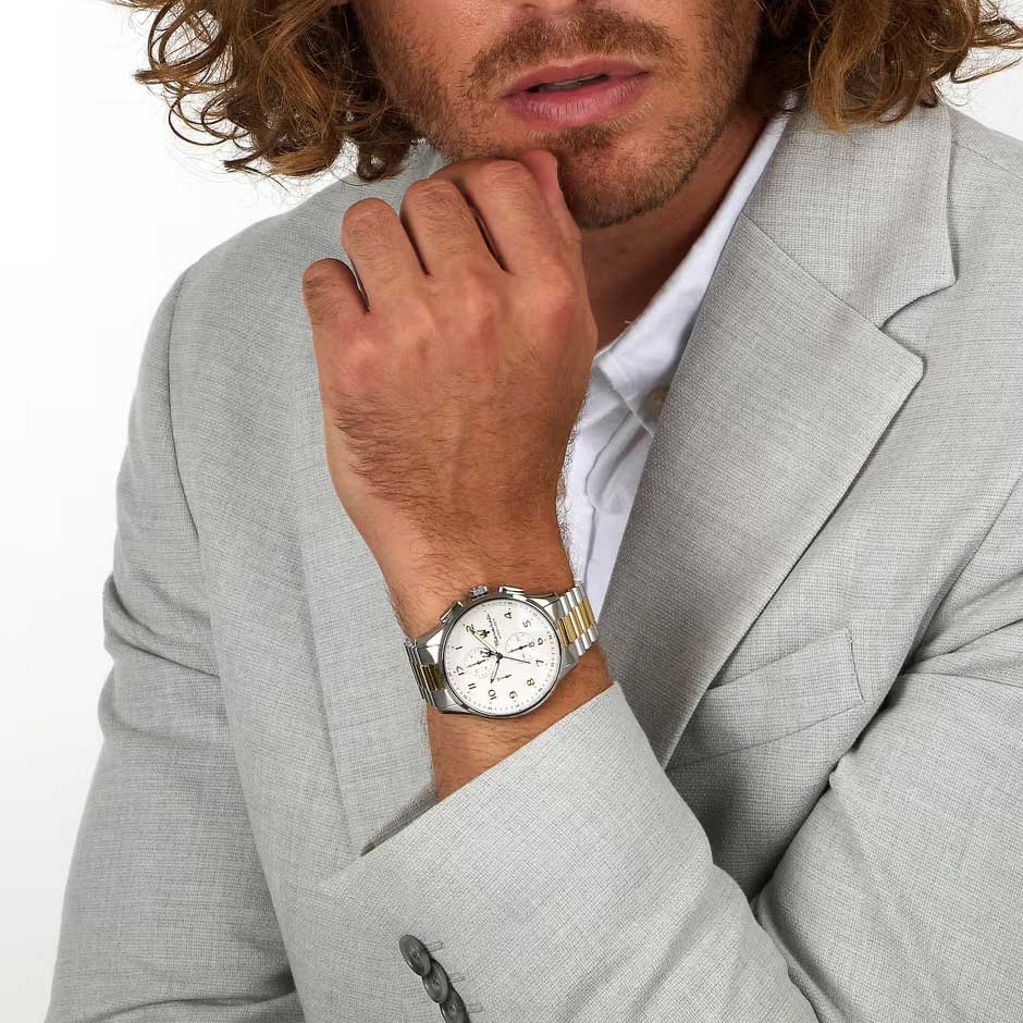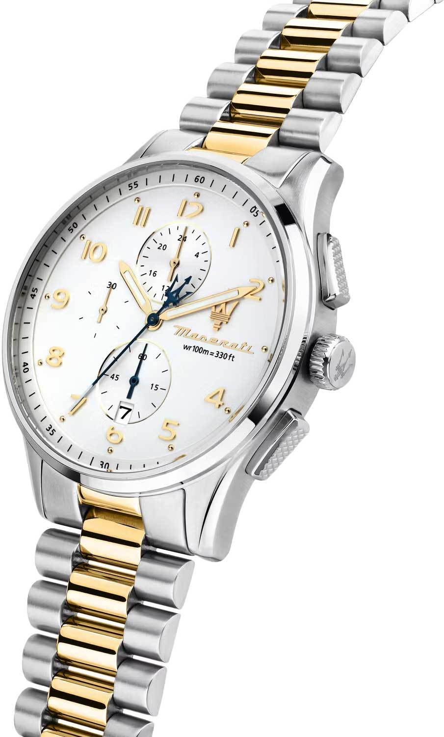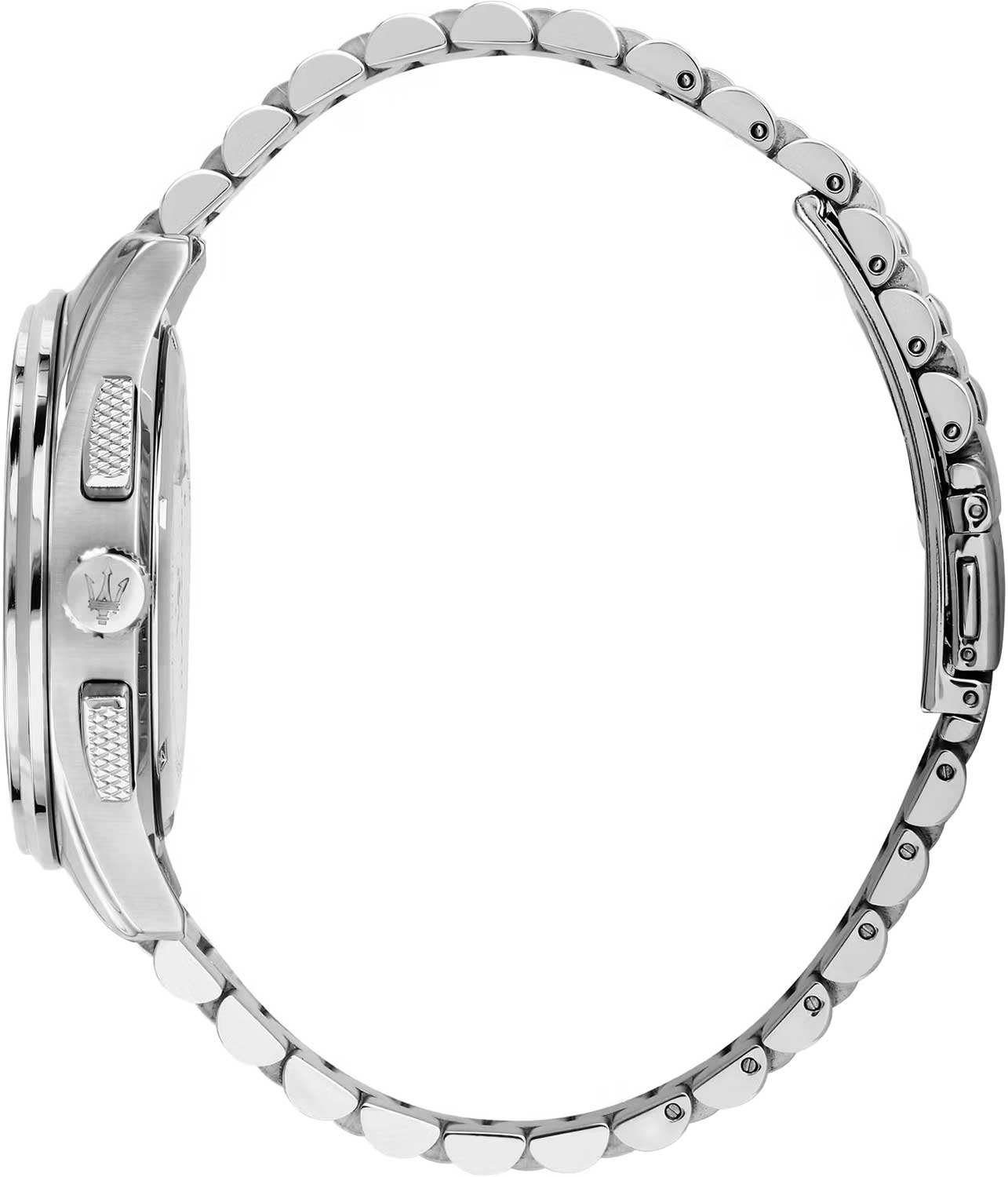 Часы-хронограф с секундомером до 30мин. 12-ти и 24-х часовой формат времени. Циферблат с метками в виде арабских цифр украшен фирменным логотипом «Maserati». Окошко даты находится в положении 6 часов. Завинчивающаяся задняя крышка и заводная головка с защитой. Браслет с раскладывающейся застежкой.