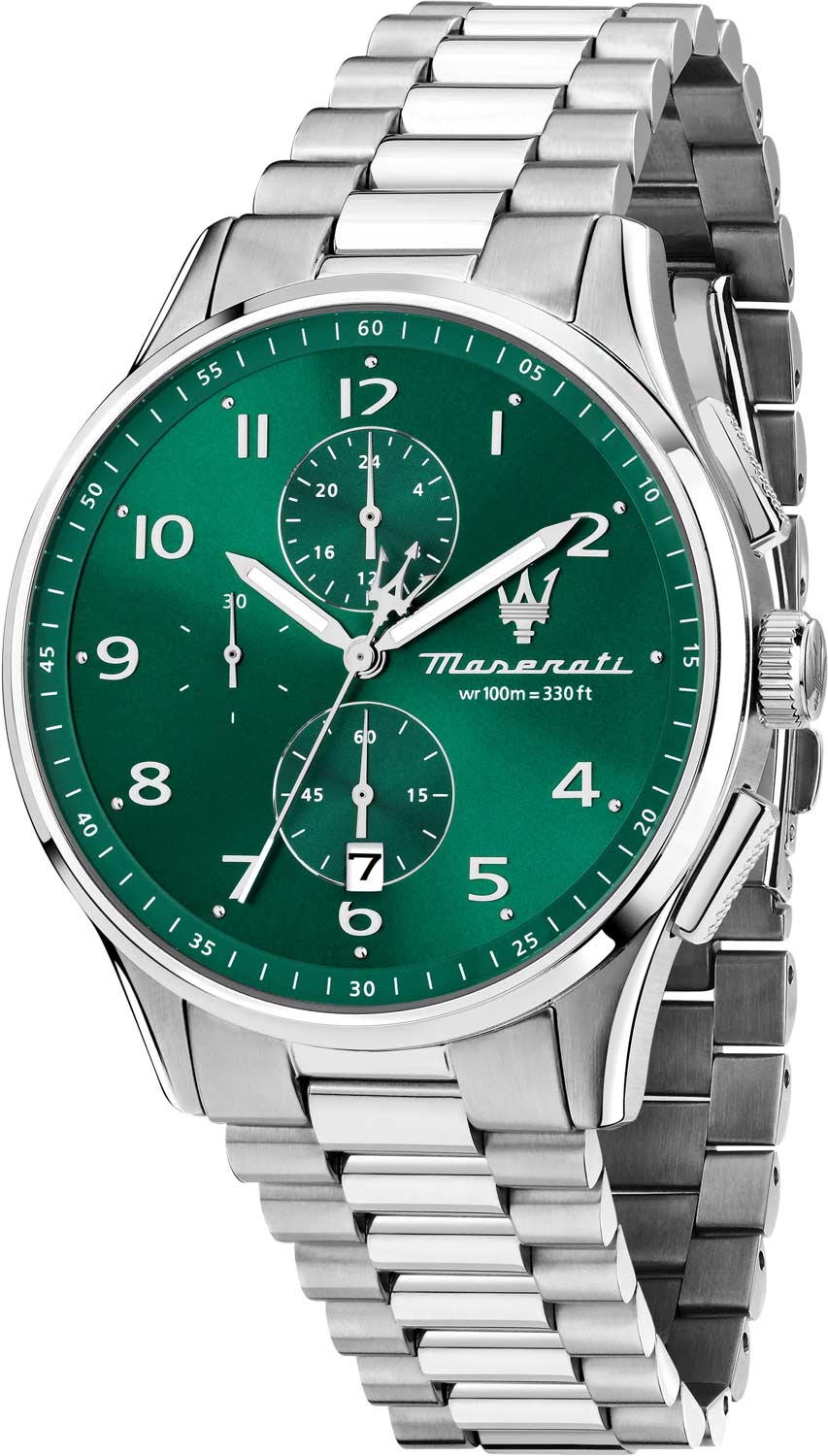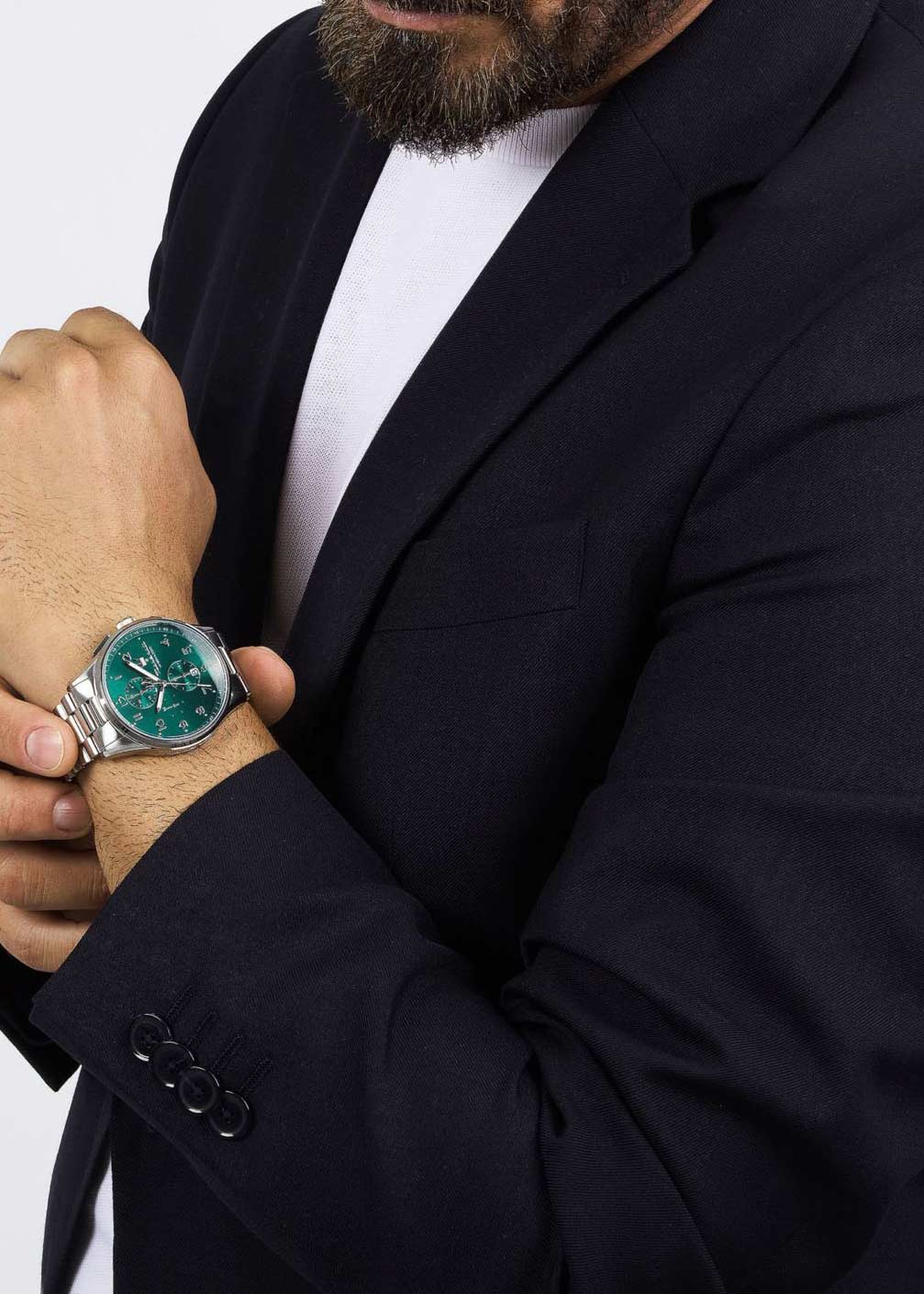 Мужские наручные часы-хронограф с секундомером до 30мин. 12-ти и 24-х часовой формат времени. Круглый стальной корпус с полированной и сатинированной поверхностью. Циферблат с логотипом бренда выполнен по технологии Sunray (солнечные лучи) и защищен минеральным стеклом.