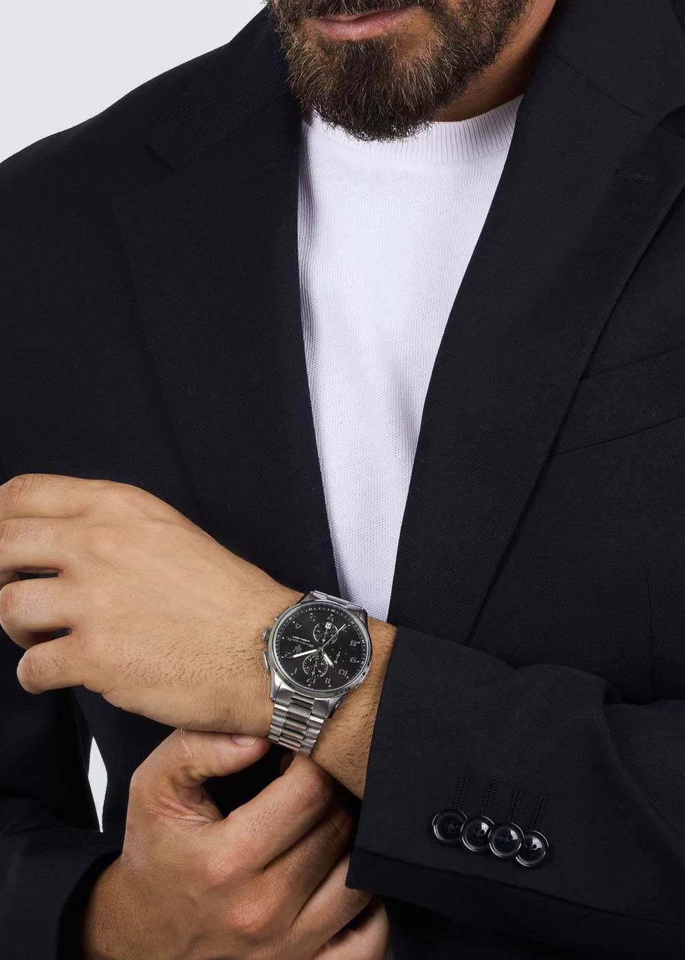 Мужские наручные часы-хронограф с секундомером до 30мин. 12-ти и 24-х часовой формат времени. Круглый стальной корпус с полированной и сатинированной поверхностью. Циферблат с логотипом бренда выполнен по технологии Sunray (солнечные лучи) и защищен минеральным стеклом.