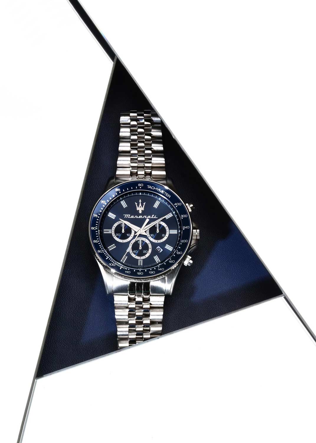Часы-хронограф с секундомером и тахиметром. 12-ти и 24-х часовой формат времени. Круглый стальной корпус. Циферблат выполнен по технологии Sunray (солнечные лучи) и украшен фирменным логотипом ''Maserati''. Метки в виде штрихов.