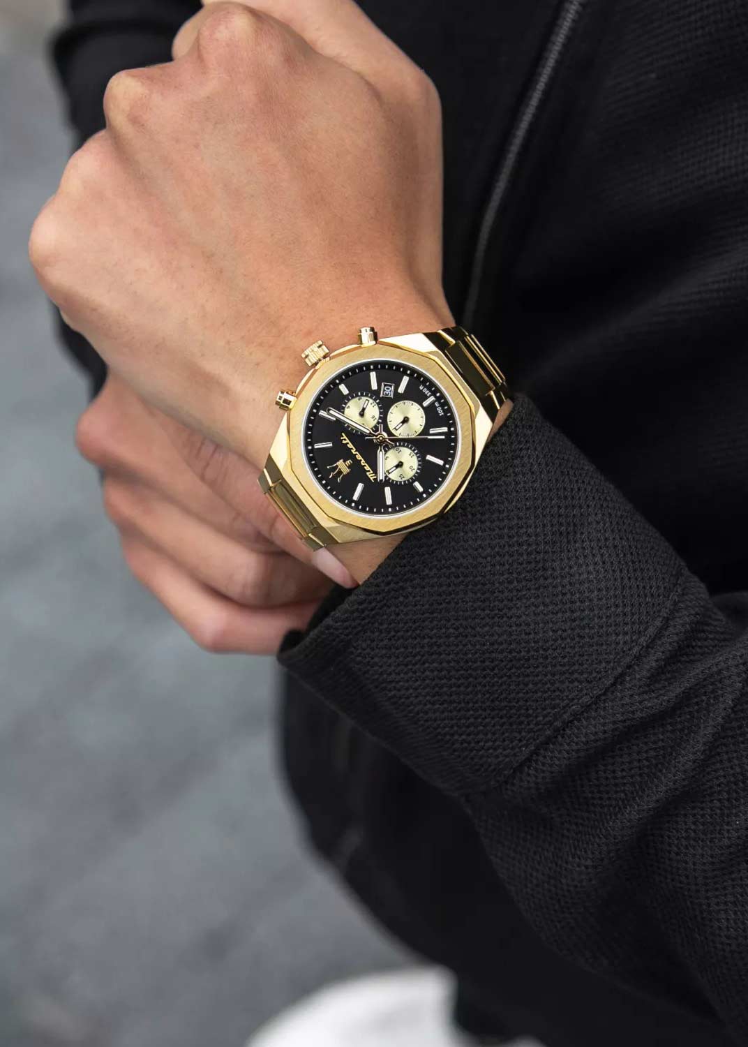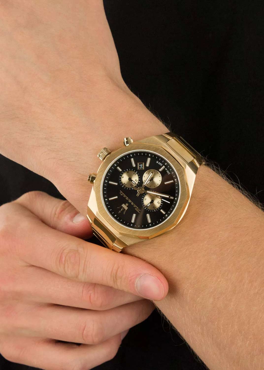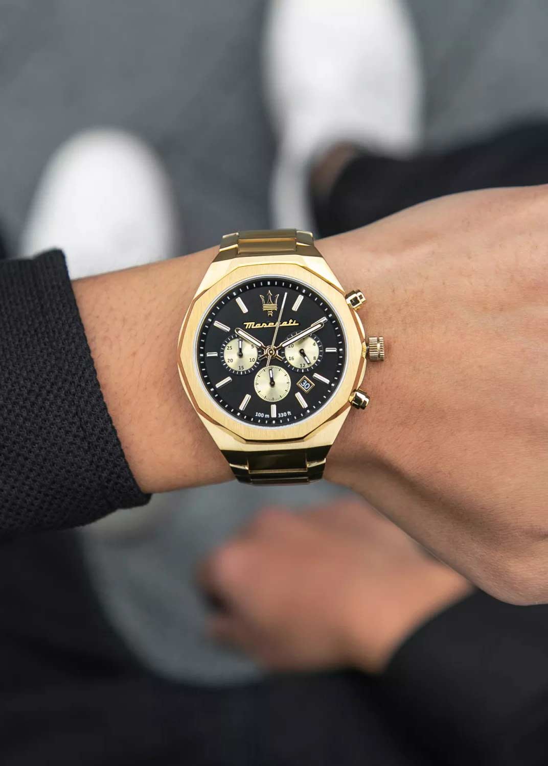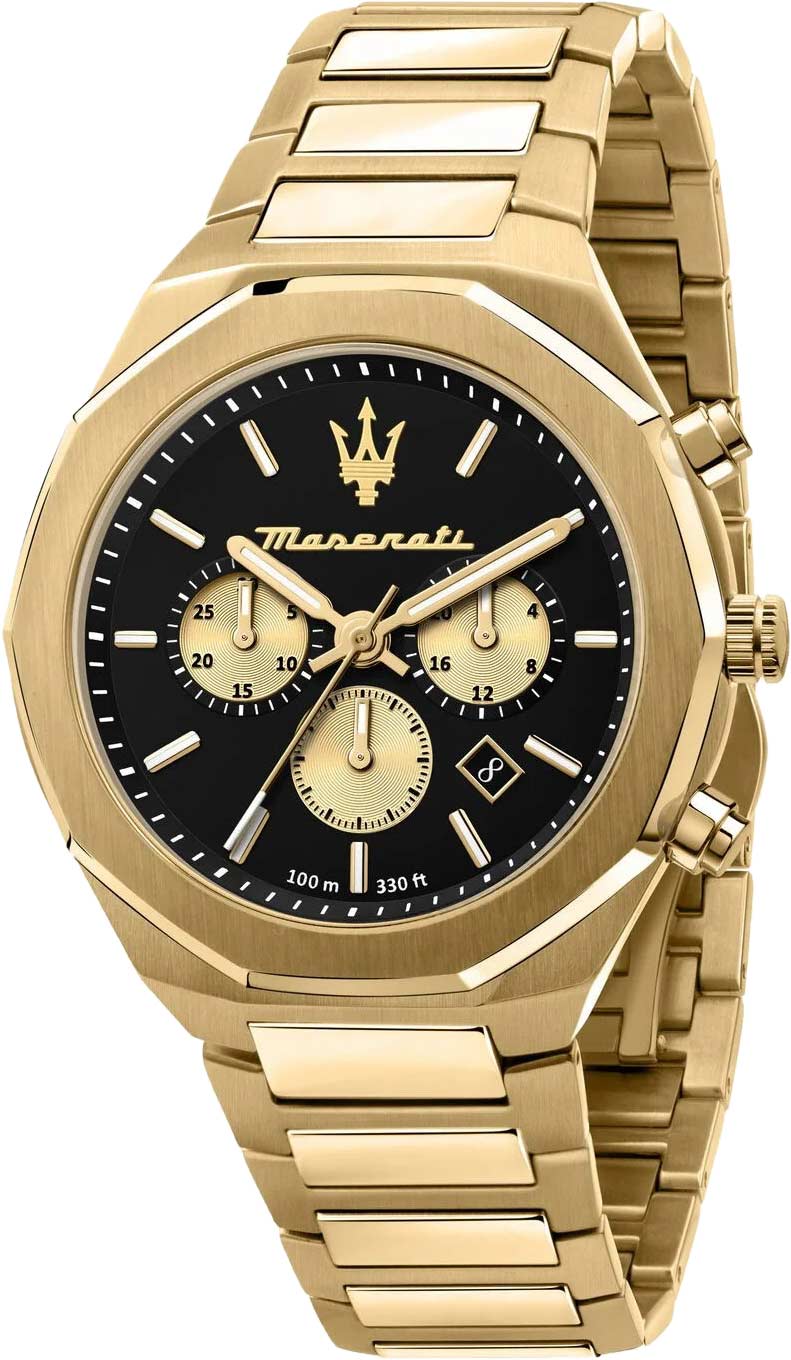 Часы-хронограф с секундомером. 12-ти и 24-х часовой формат времени. Стальной корпус. Циферблат с метками в виде штрихов украшен фирменным логотипом ''Maserati''.