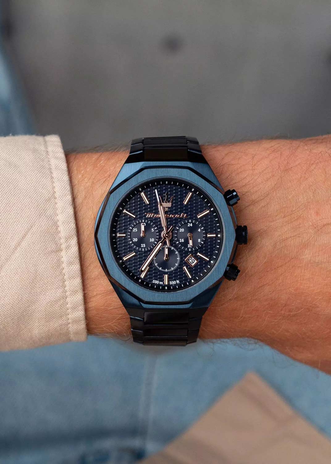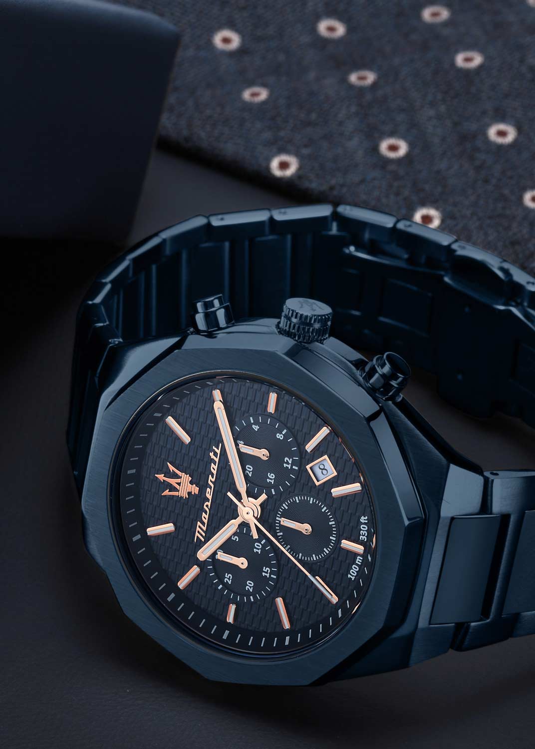 Часы-хронограф с секундомером. 12-ти и 24-х часовой формат времени. Стальной корпус. Текстурный циферблат с метками в виде штрихов украшен фирменным логотипом ''Maserati''.