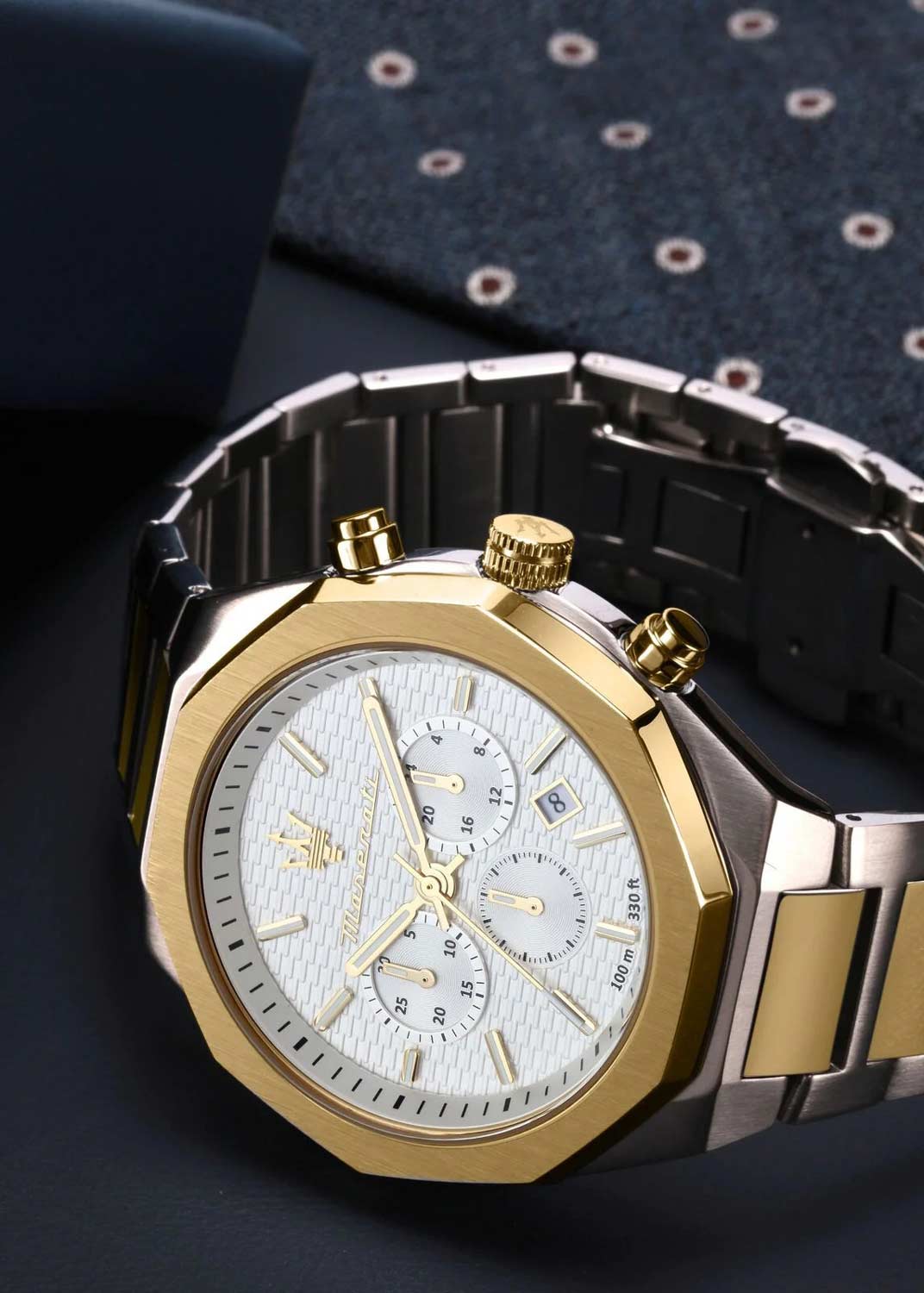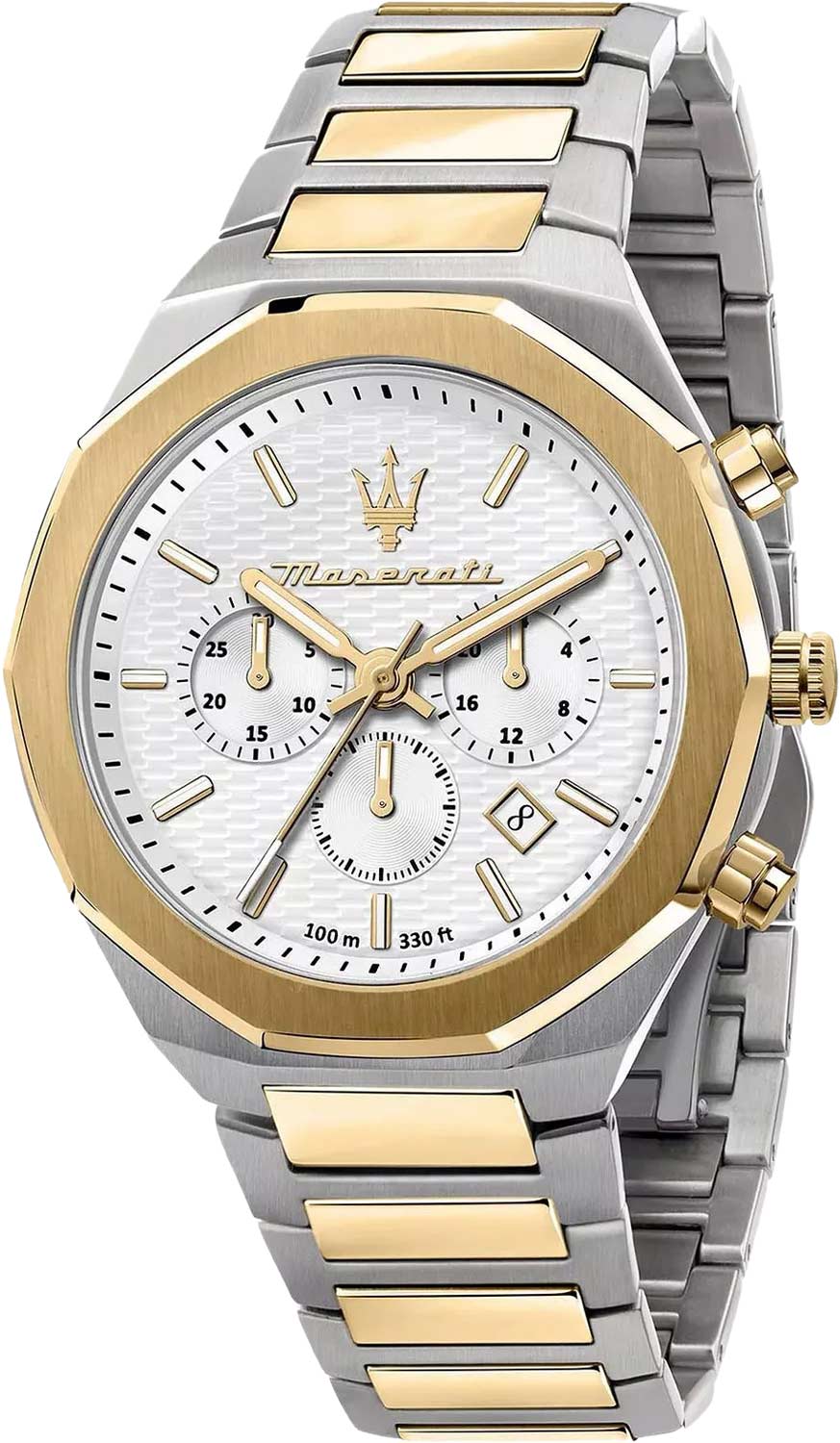Часы-хронограф с секундомером. 12-ти и 24-х часовой формат времени. Стальной корпус. Текстурный циферблат с метками в виде штрихов украшен фирменным логотипом ''Maserati''.