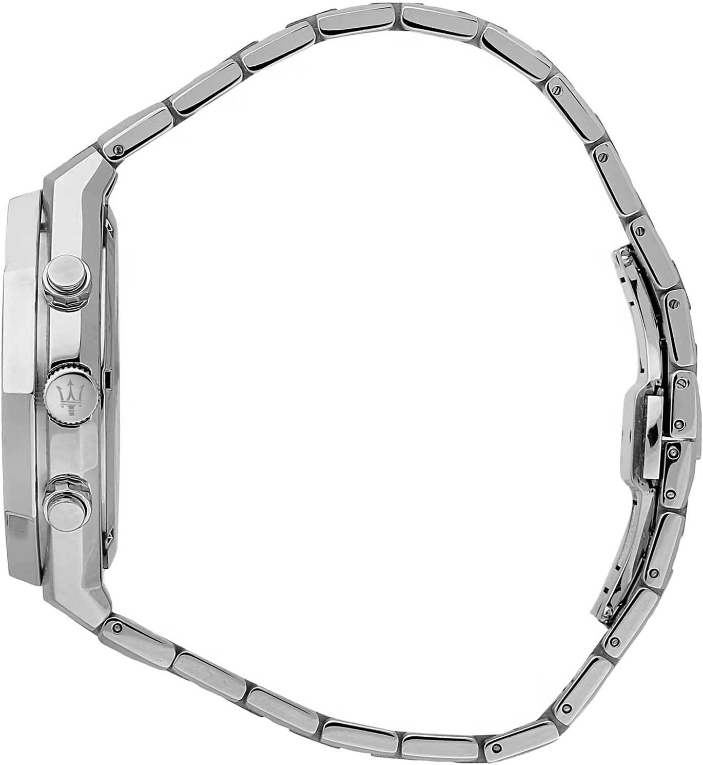 Часы-хронограф с секундомером. 12-ти и 24-х часовой формат времени. Циферблат выполнен по технологии Sunray (солнечные лучи) и украшен фирменным логотипом «Maserati». Метки в виде штрихов. Окошко даты находится в положении между отметками 4 и 5 часов. Завинчивающаяся задняя крышка и заводная головка. Браслет с раскладывающейся застежкой.