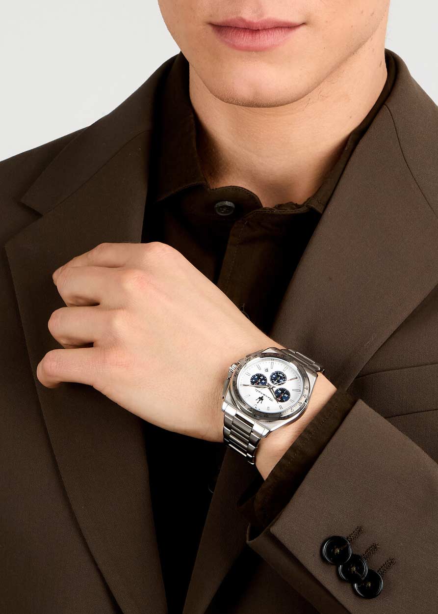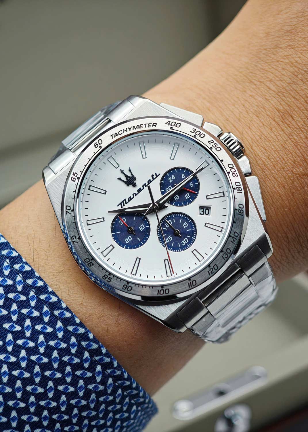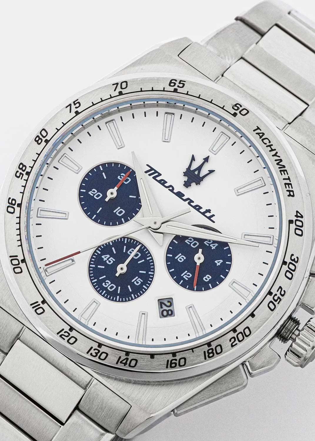 Часы-хронограф с секундомером и тахиметром. 12-ти и 24-х часовой формат времени. Круглый стальной корпус. Циферблат украшен фирменным логотипом ''Maserati''. Метки в виде штрихов.