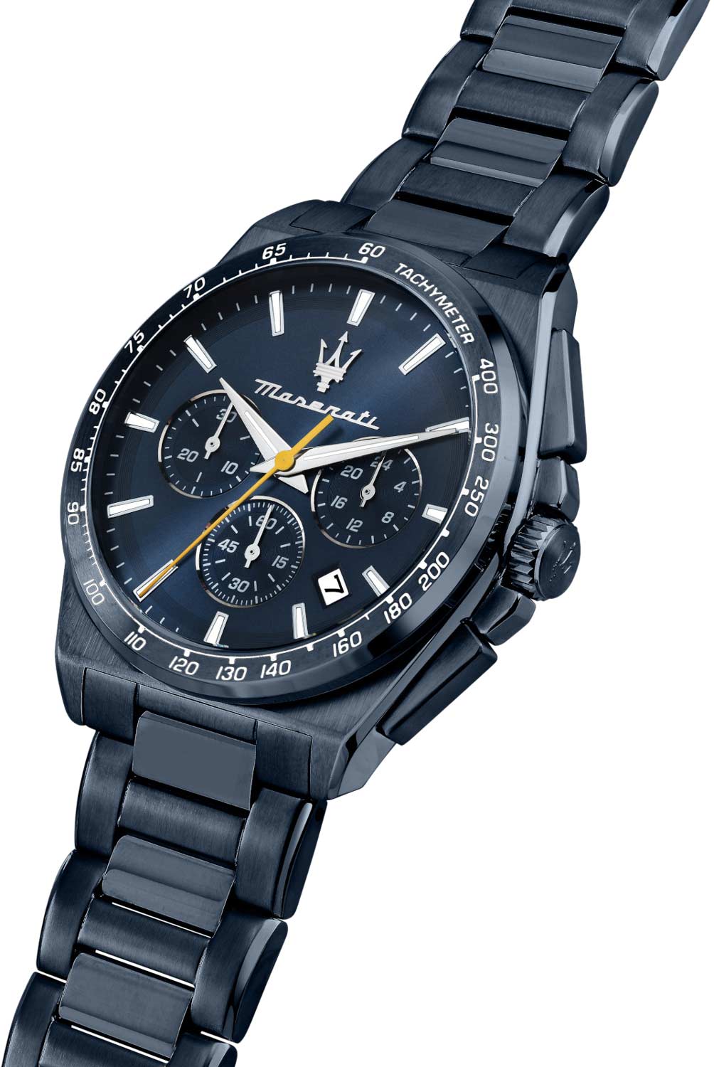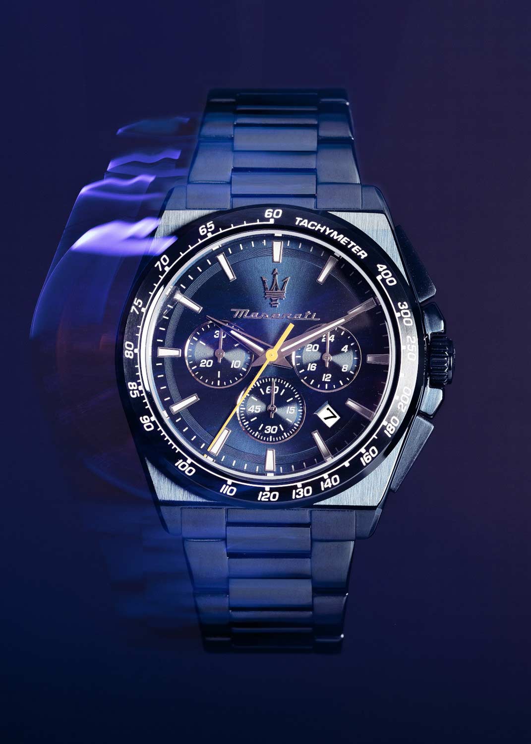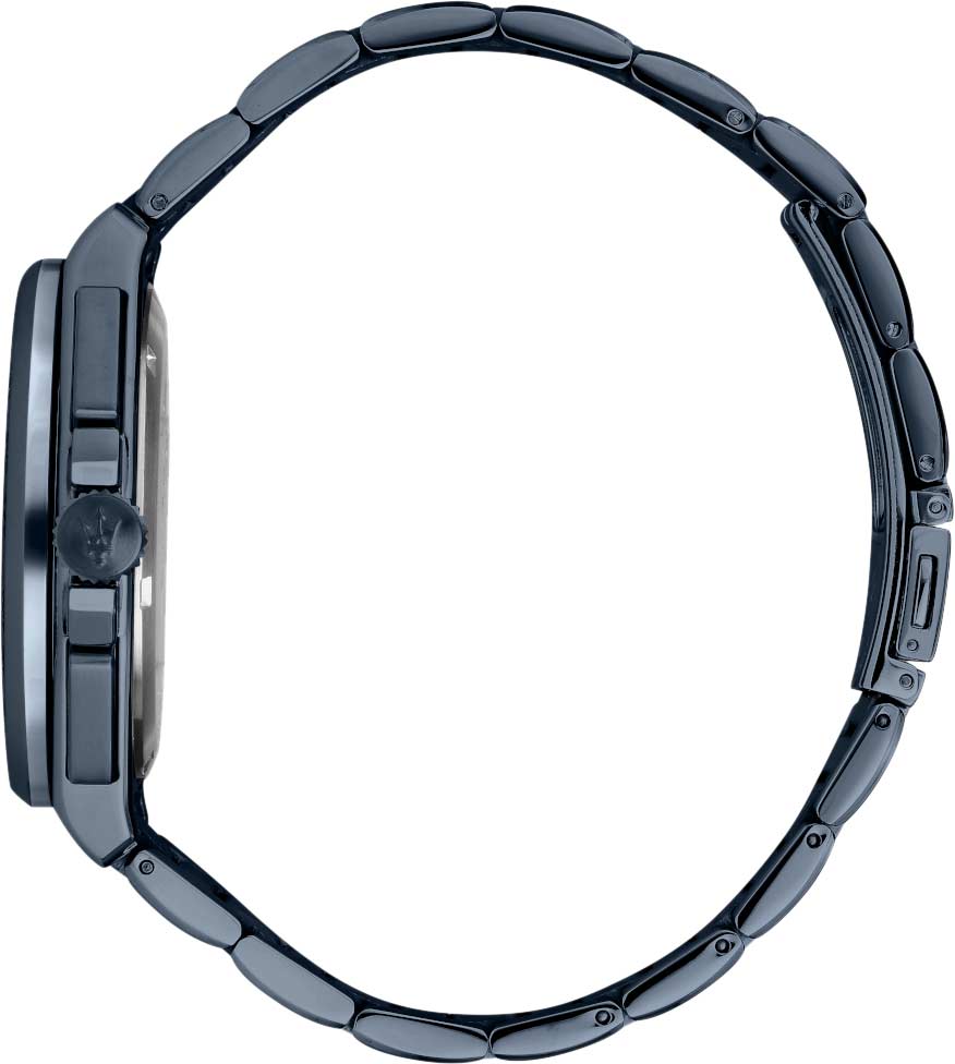 Часы-хронограф с секундомером и тахиметром. 12-ти и 24-х часовой формат времени. Круглый стальной корпус. Циферблат выполнен по технологии Sunray (солнечные лучи) и украшен фирменным логотипом ''Maserati''. Метки в виде штрихов.