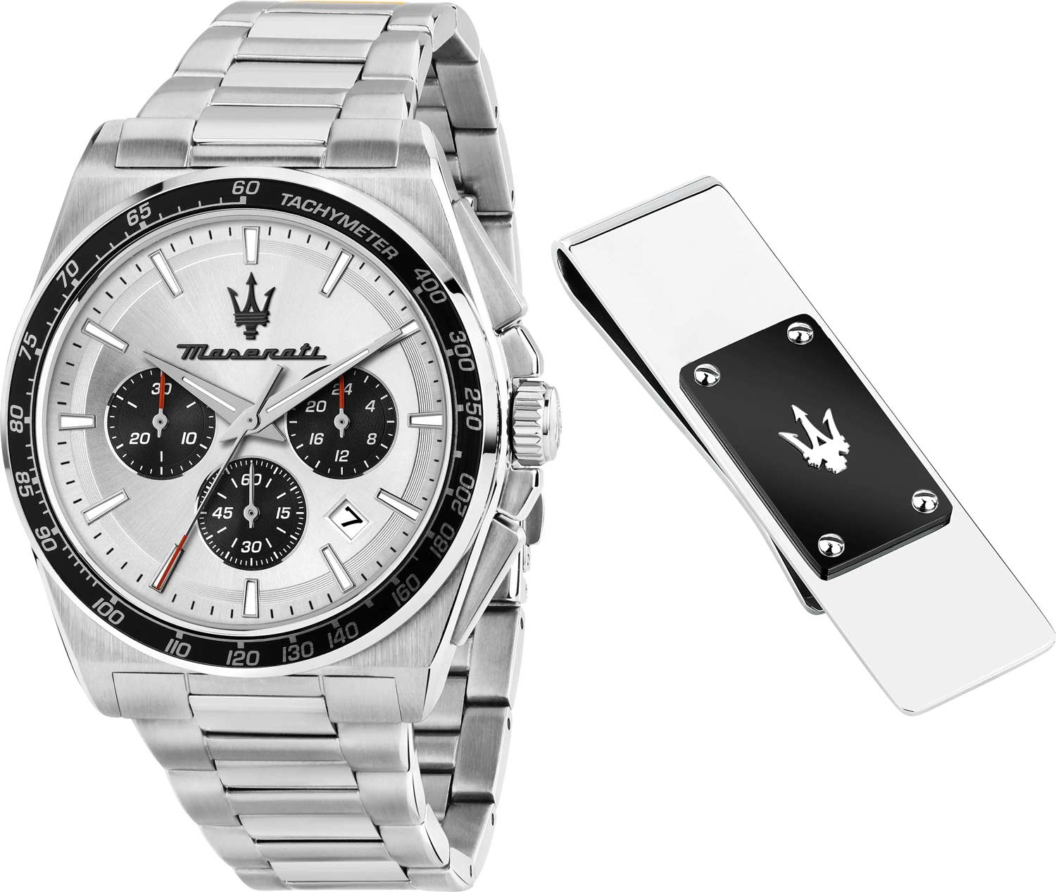 Окошко даты находится между часовыми метками 4 и 5. Рифленая заводная головка с защитой. Завинчивающаяся задняя крышка. Браслет с раскладывающейся застежкой. В комплекте дизайнерский зажим для денег ''Maserati''.
