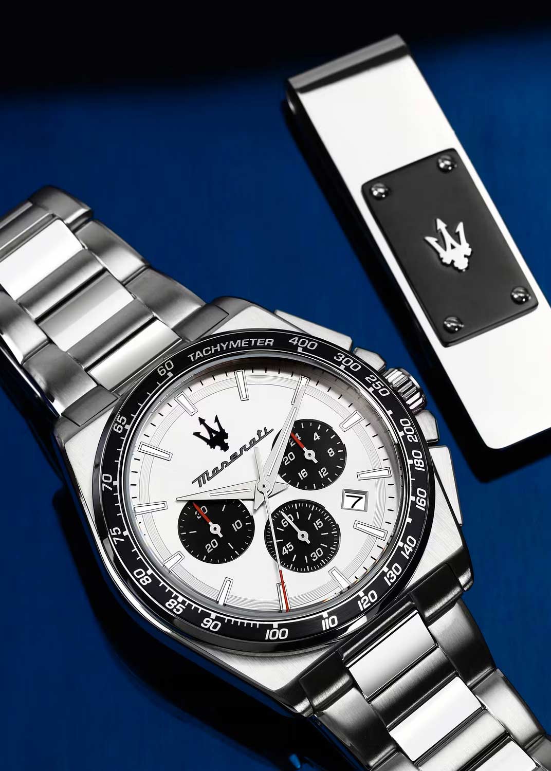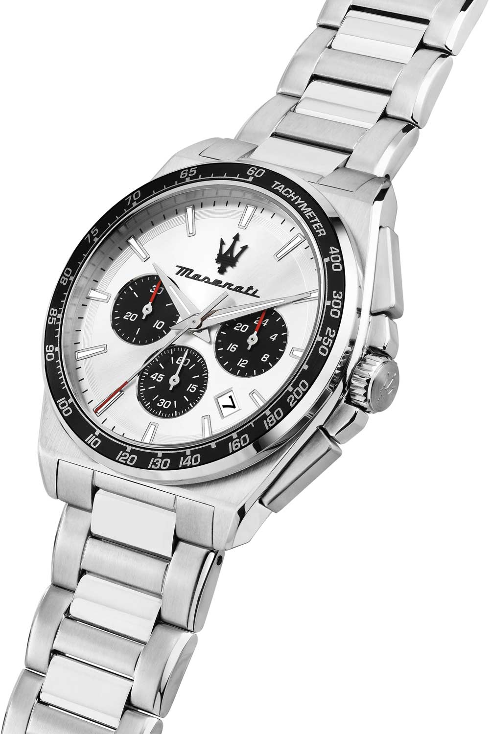 Часы-хронограф с секундомером и тахиметром. 12-ти и 24-х часовой формат времени. Круглый стальной корпус. Циферблат выполнен по технологии Sunray (солнечные лучи) и украшен фирменным логотипом ''Maserati''. Метки в виде штрихов.