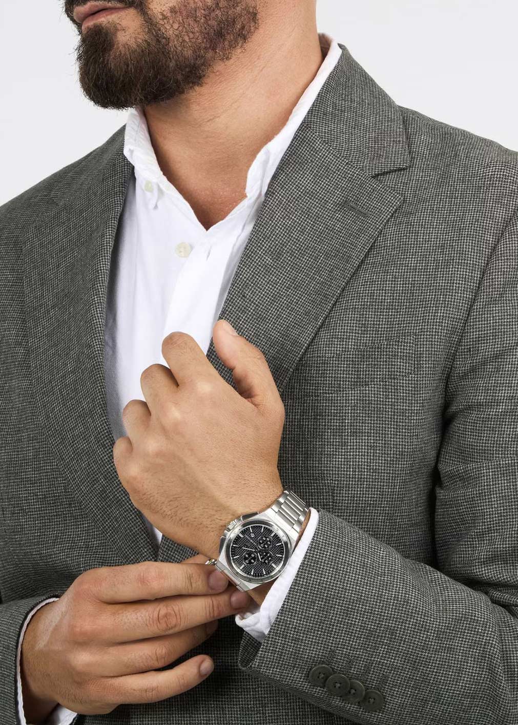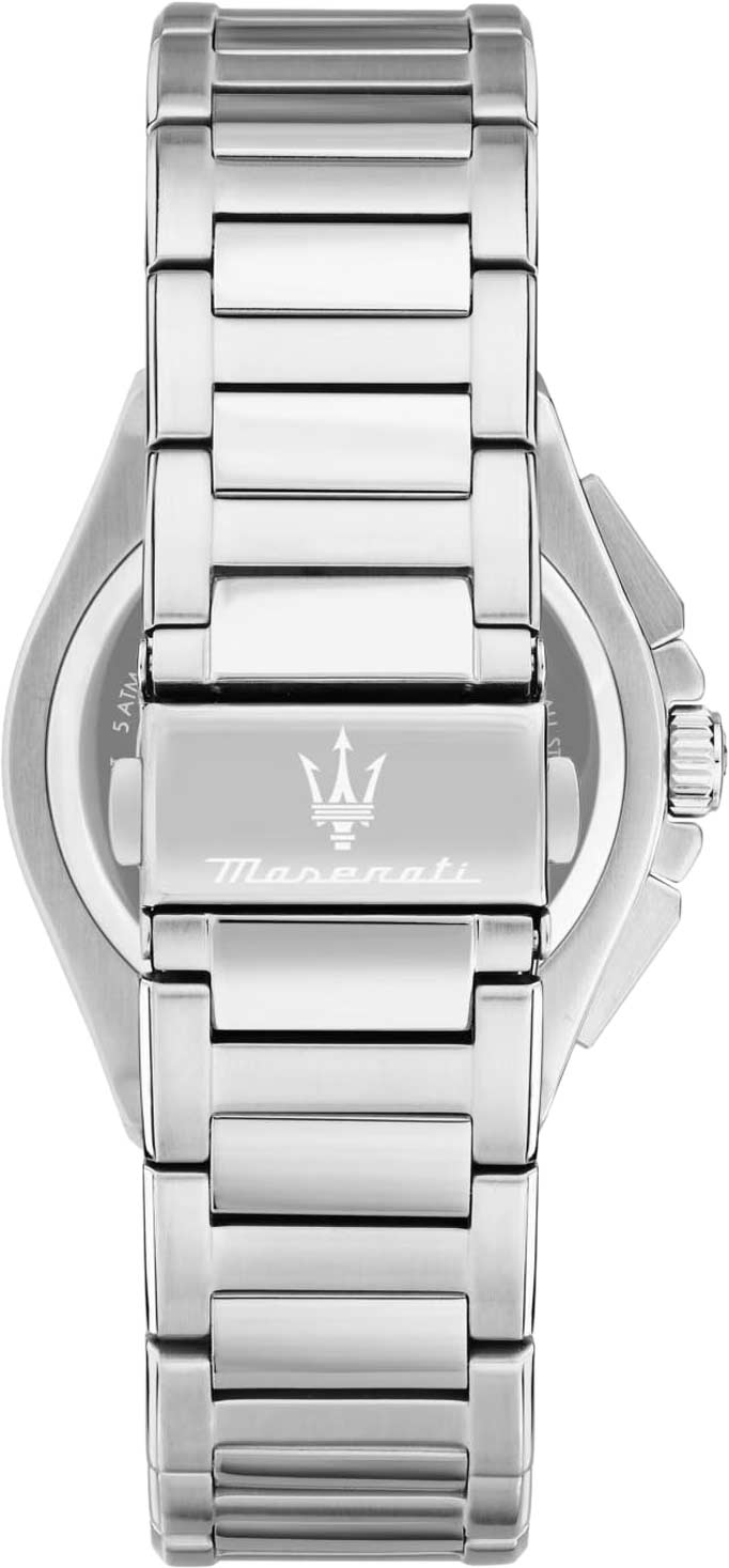 Часы-хронограф с секундомером и тахиметром Velocita Slim. 12-ти и 24-х часовой формат времени. Круглый стальной корпус. Циферблат с рисунком в клетку украшен фирменным логотипом ''Maserati''. Метки в виде штрихов.